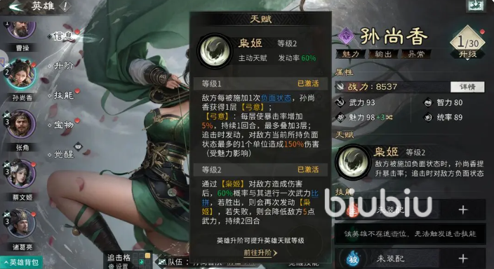 孙策则主打近战压制与持续干扰,其主动技能不仅造成单体伤害,还附带概率夺取敌方追击格的效果,限制对手节奏。追击技兼具减防与高额单体输出双重功能;被动效果可稳定提升自身暴击率。主动技能还有概率为目标施加“洪水”状态,造成持续伤害;若目标已处于“洪水”状态,则大概率追加“虚弱”效果,降低其攻防属性,实现多维度软性压制,适用于中后期持久战与PVP环境。