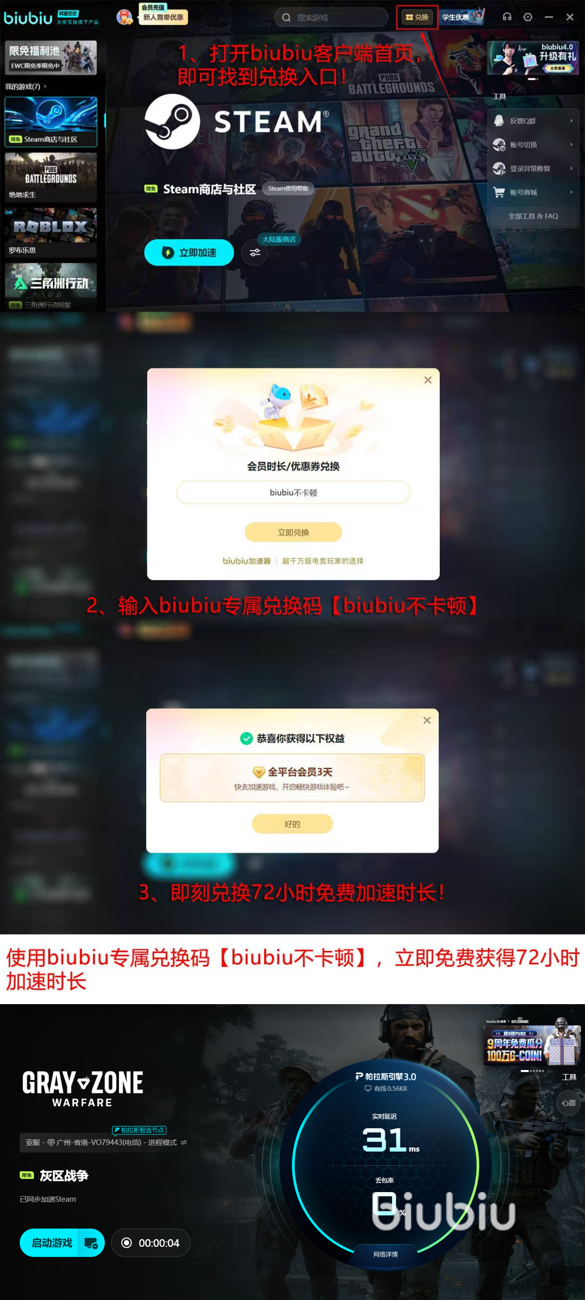 新用户注册即可获得24小时全功能免费加速权限。完成首次登录后,在兑换码入口输入【biubiu不卡顿】,额外领取72小时加速时长。累计96小时的有效使用周期,足以覆盖拉芒岛全区域探索、高难度渗透任务演练及战术小队协同作战等核心玩法,帮助玩家在零干扰环境下深度体验游戏机制。