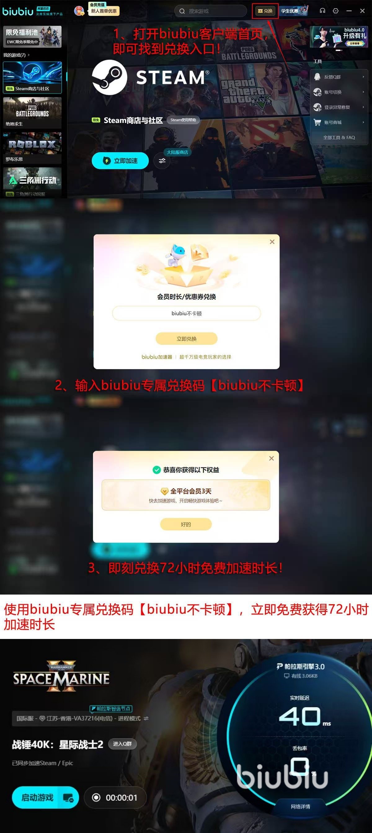 软件界面遵循极简交互逻辑,“一键加速”功能大幅降低新手学习成本。后台运行期间内存占用控制严格,不会干扰其他程序正常调度。当前新用户注册并完成首次登录,即可获赠24小时免费加速时长;前往兑换中心输入激活码【biubiu不卡顿】,还可额外领取72小时服务权益。两项福利叠加后,总计享有96小时无门槛加速体验。