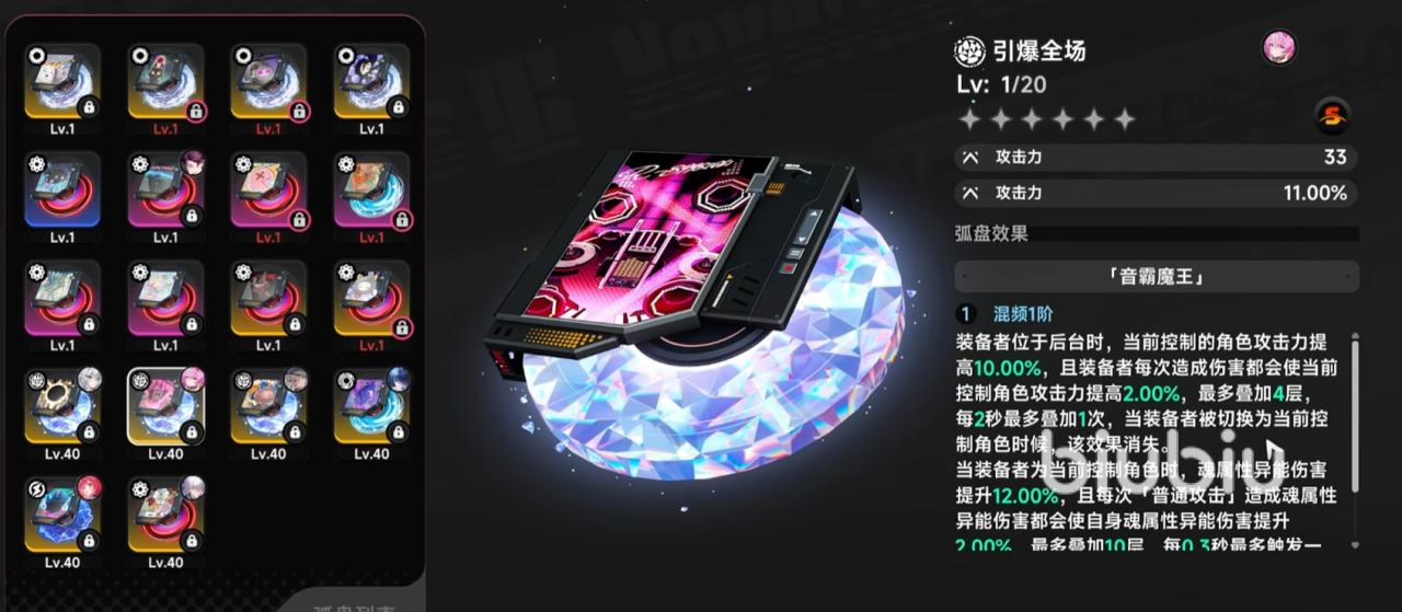 引爆全场弧盘服务于多角色轮换体系,专为后台增益型阵容设计。当装备者处于后台时,当前操作角色获得10%攻击力加成;每次后台角色造成伤害,再为前台角色叠加2%攻击力,最多叠加4层。该机制鼓励高频角色切换与伤害节奏规划,既保障能量资源稳定回充,又通过后台伤害触发持续强化前台输出,适用于强调技能循环管理与资源调度的战术流派。