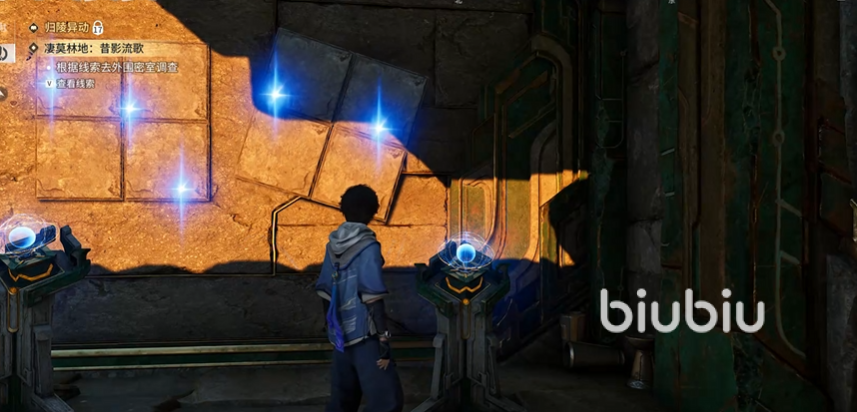 第一枚钥匙碎片位于二层平台。此处需激活黄色机关,使光束经镜面反射。但镜面被藤蔓遮挡,须使用火属性技能或具备元流能力的角色将其焚毁。清除障碍后,再次启动黄色机关,左侧将浮现黄色踏板;此时需牵引附近石块压住该踏板,完成首次联动。随后移步右侧区域,依相同方式操作另一处踏板。最后登顶至最高层,用火系手段清除顶层藤蔓,激活顶部黄色机关,解谜成功后返回平台拾取首枚钥匙碎片。