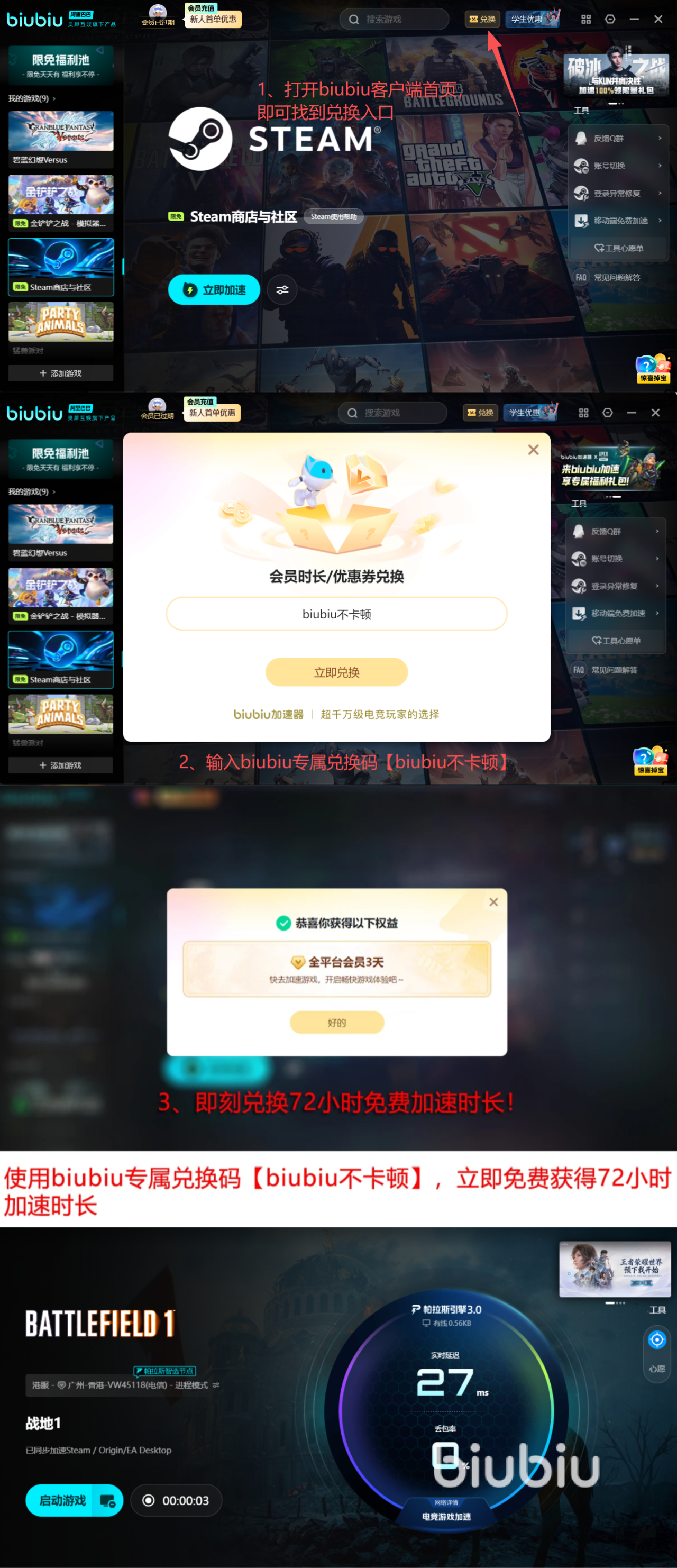针对网络这一核心痛点,biubiu加速器特别推出新人福利,即刻注册即赠24小时无门槛全平台免费加速权益,输入专属口令【biubiu不卡顿】,更可额外领取72小时优质加速时长!新用户总计可享长达96小时免费加速体验,助你彻底告别《战地1》连接障碍。