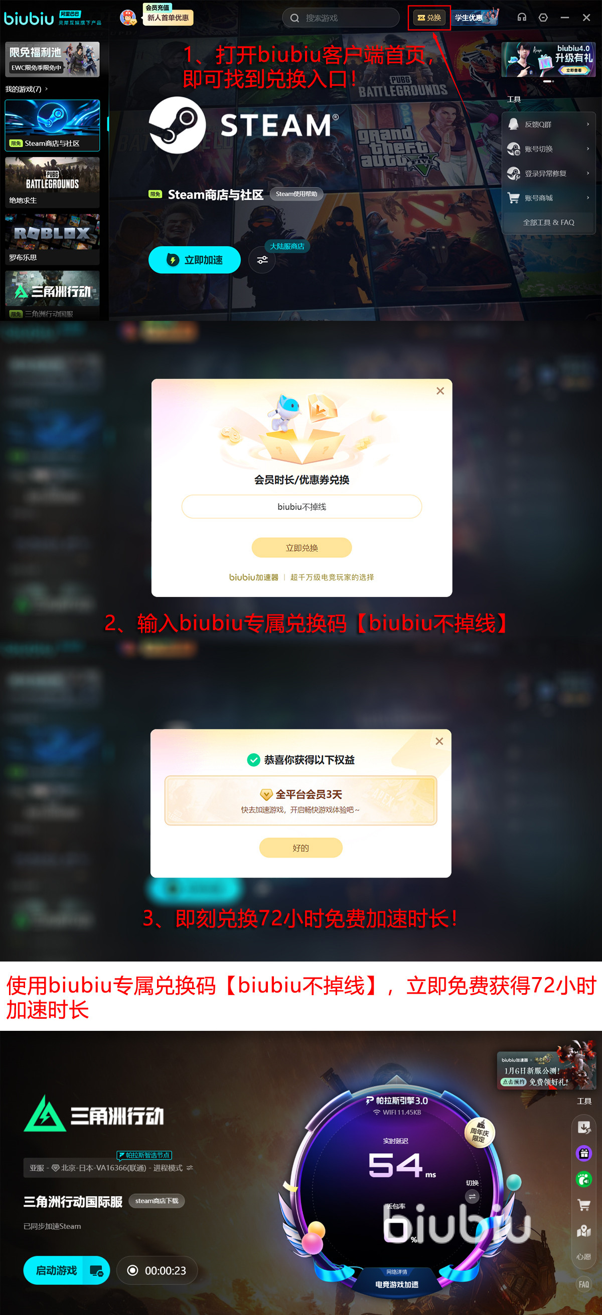 biubiu用户能拿到的优惠一定要都领到,新人是有专属大礼包的,注册登录后就可拿取,包含免费的24小时加速时间用,还有额外的兑换优惠在,【biubiu不掉线】拿去兑换下又能拿到72小时额外加速时间用了,其实新人累计优惠都达到了96小时了,那能好好打好多场的。