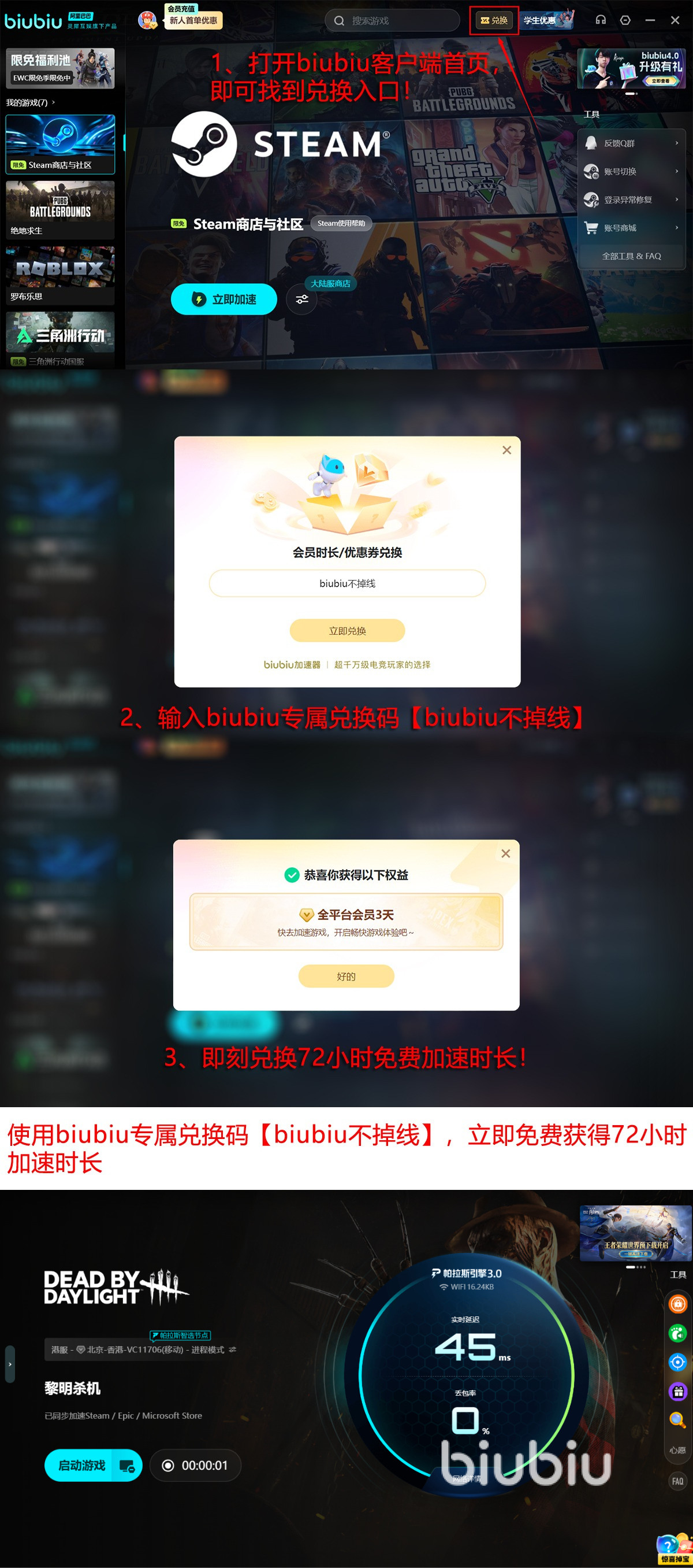 新用户注册biubiu加速器后,可立即获得24小时全功能免费试用权限。在激活界面输入兑换码【biubiu不掉线】,额外获赠72小时加速时长,总计96小时无限制使用。该权益覆盖PC端全区域服务器节点,支持《黎明杀机》国服、亚服、欧服及美服稳定连接。