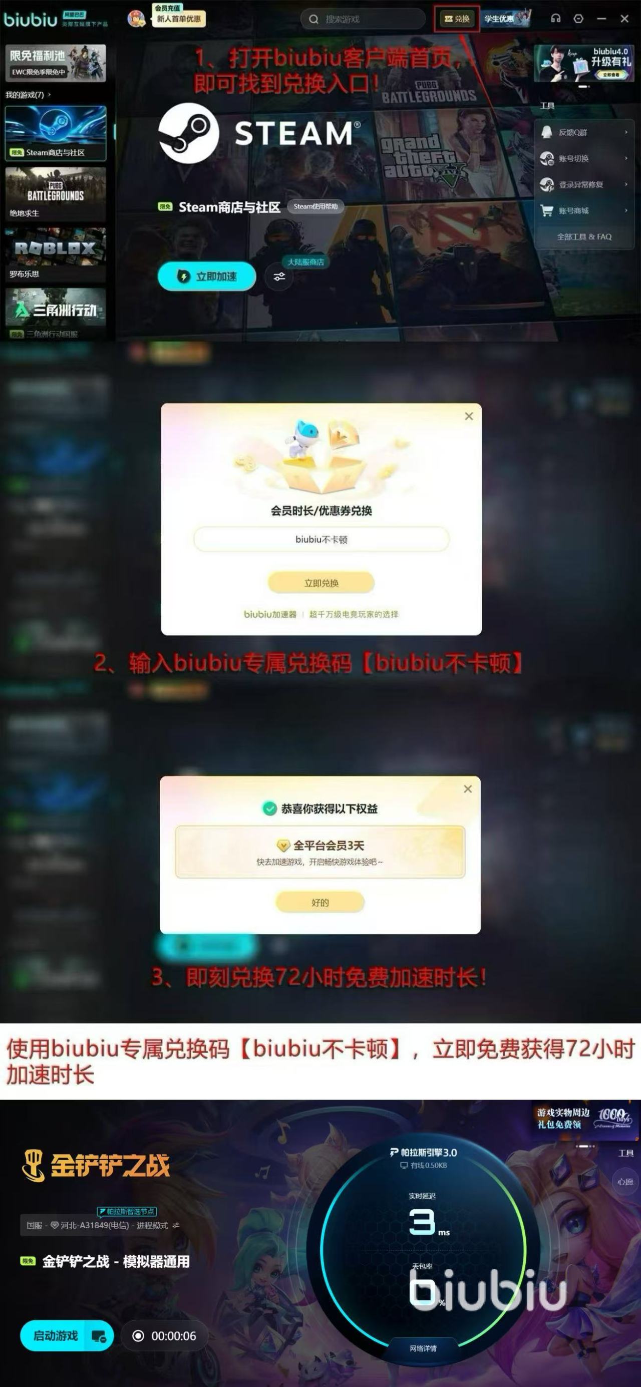 该工具已覆盖主流电竞赛事生态,PUBG全球系列赛冠军选手小叮当长期选用其作为训练与比赛专用加速方案。新用户注册即赠24小时全功能试用权限,输入专属兑换码【biubiu不卡顿】还可额外激活72小时加速服务,累计达96小时免费体验周期,无需绑定支付方式即可完整验证稳定性与兼容性。
