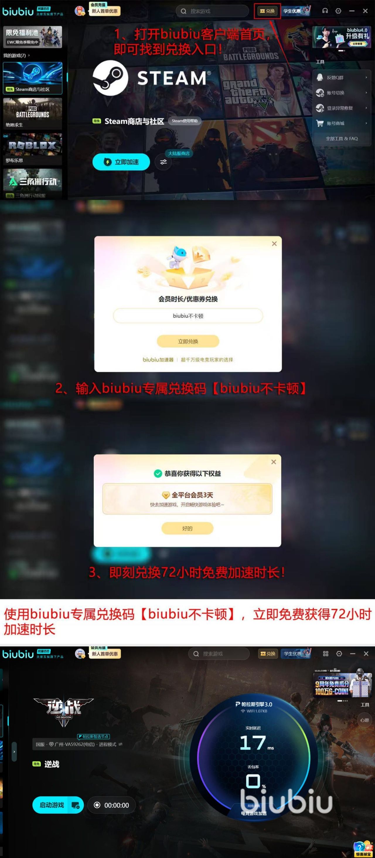 福利方面,biubiu对新用户还是挺实在的。注册完成之后可以直接获得24小时的免费加速时长,不用付费就能先体验一下效果。体验完之后如果觉得不错,还可以输入兑换码【biubiu不卡顿】,再领取72小时的免费加速时长。这样就直接有96小时能免费加速,对于玩家们来测试一下加速效果,是完全够的。