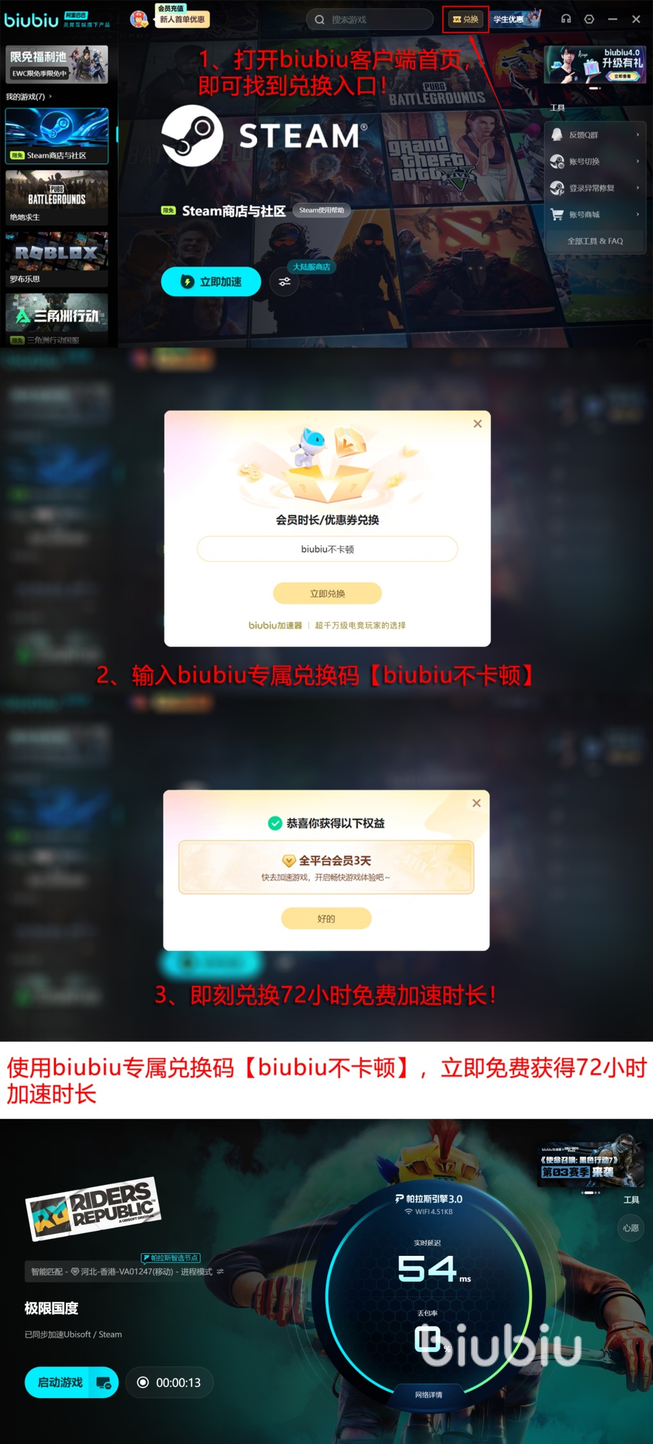 现在下载biubiu还有充裕的免费试用时间赠送!新用户注册就能领24小时,在软件里找到兑换入口输入【biubiu不卡顿】,还能再拿72小时,这个口令所有人都能用!而且biubiu的游戏库挺全的,不光极限国度,其他常玩的联机游戏基本也都能搜到,以后换别的游戏也用得上。