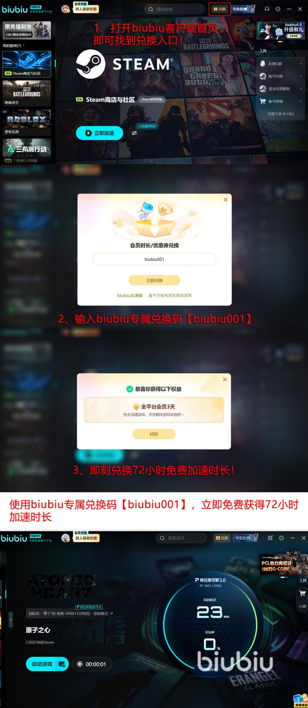 作为PUBG冠军选手小叮当所指定的加速器,也是Pero战队官方指定的训练比赛的工具,现在更有福利送给众多的玩家,那就是新老用户用兑换码【biubiu001】,可领取三天免费时长,新用户注册再送24小时。此时新用户搭配兑换码使用共可享96小时免费加速。
