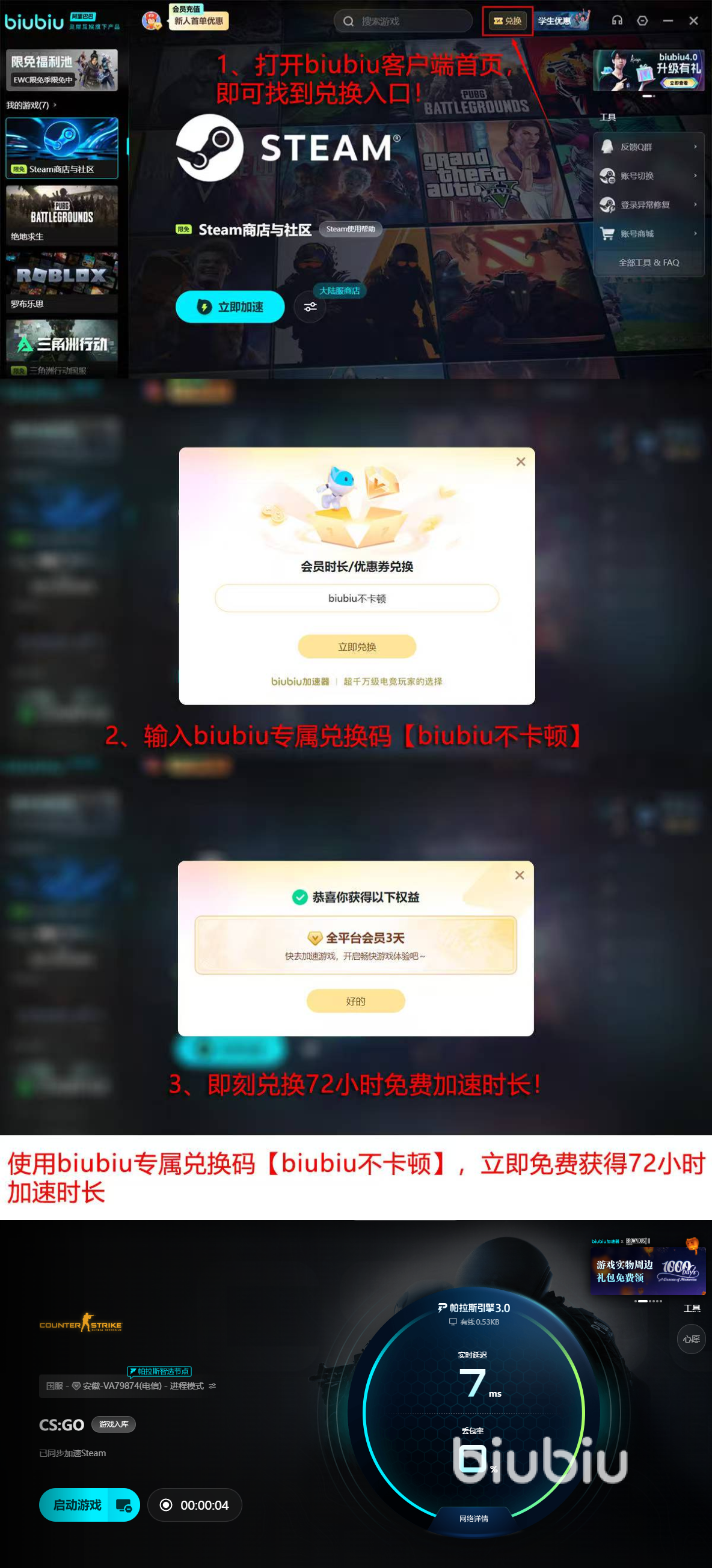 除此之外,为了让大家能够更加沉浸式的感受biubiu平台的具体服务,官方在这一方面给大家提供了不少可以免费感受的机会,比如给新人提供一整天体验,该福利不需要大家自己领取,初次登录平台自动发放,所以才接触这个应用,不知道如何使用的用户就可以不用担心,能直接搜索自己玩的游戏进行体验。平台还额外提供三整天体验时间,用【biubiu不卡顿】就能兑换到手,所以大家哪怕错过新人福利也无需担心。