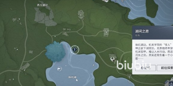 任务起始于指定传送点。抵达后向西眺望,可见湖畔伫立一名身披厚重铠甲的机关人,目光凝驻水面,神情焦灼。靠近对话后得知:他珍视的佩剑不慎沉入湖底,因机甲构造限制无法下水,只能守候岸边。此时任务正式开启,玩家需潜入湖中——水下光线柔和,环境静谧,沿系统指引前行即可发现那柄静静躺在湖床的武器。