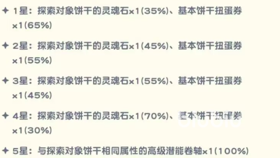 目前星座探险共包含三种子模式:饼干派遣、日常任务及“可可滴露的饼干探索”。其中,“可可滴露的饼干探索”是获取稀有饼干的重要途径,目标对象均为超稀有饼干。需注意的是,最新上线的抄袭主题饼干暂不支持该模式选择。奖励产出与所选饼干星级直接挂钩:一星饼干探索成功后,获得对应饼干零食的概率为35%,获得基础饼干扭蛋券的概率为65%;随着星级提升,饼干零食掉落率递增,而扭蛋券获取率相应下降。玩家可根据自身培养需求,合理规划高星饼干的探索投入。