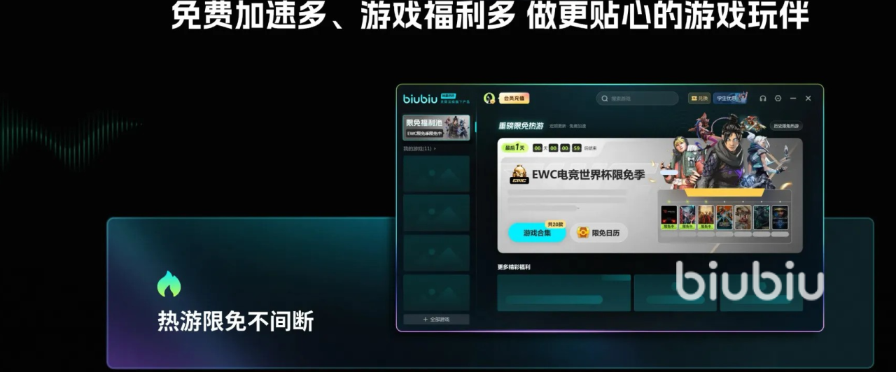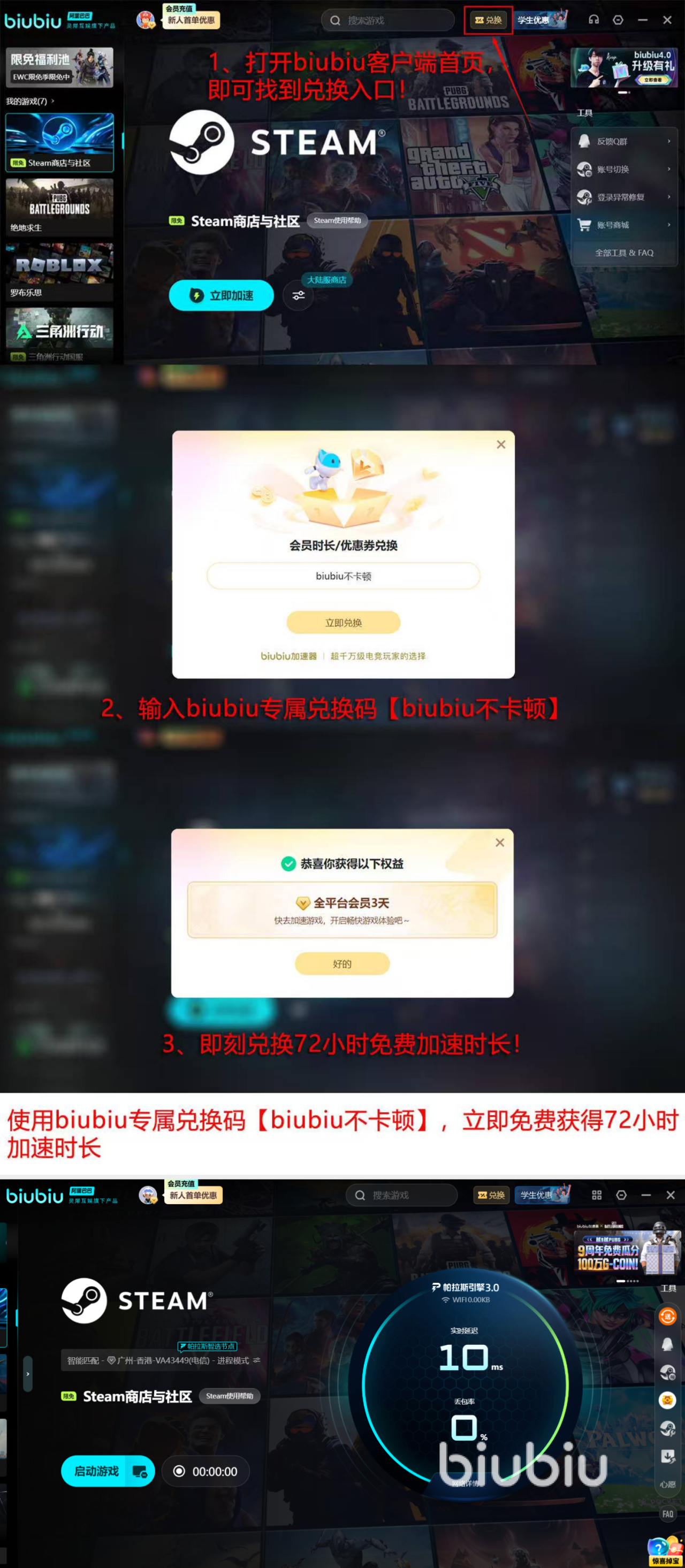面向新用户,biubiu加速器提供零门槛试用机制:完成基础账号注册即可获赠24小时全功能加速时长,无需绑定支付方式即可体验完整性能。另附通用兑换码【biubiu不卡顿】,激活后额外增加72小时有效时长,新老用户均可使用。两项权益叠加,首次注册用户最高可享累计96小时免费加速服务,充分覆盖多轮测试周期,便于全面评估其在Steam商店浏览、大型游戏下载(如《赛博朋克2077》《艾尔登法环》)、以及多人联机模式下的实际表现。