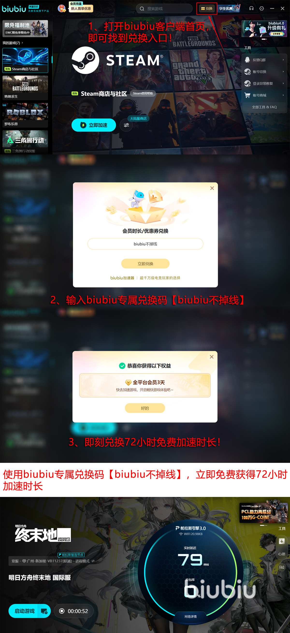 新用户首次启动biubiu加速器,即可领取24小时免费加速时长;参与“biubiu不掉线”兑换活动,还可额外获取72小时加速服务。两项叠加,新人可连续享受96小时无门槛加速体验,从容迎接春晓时版本。