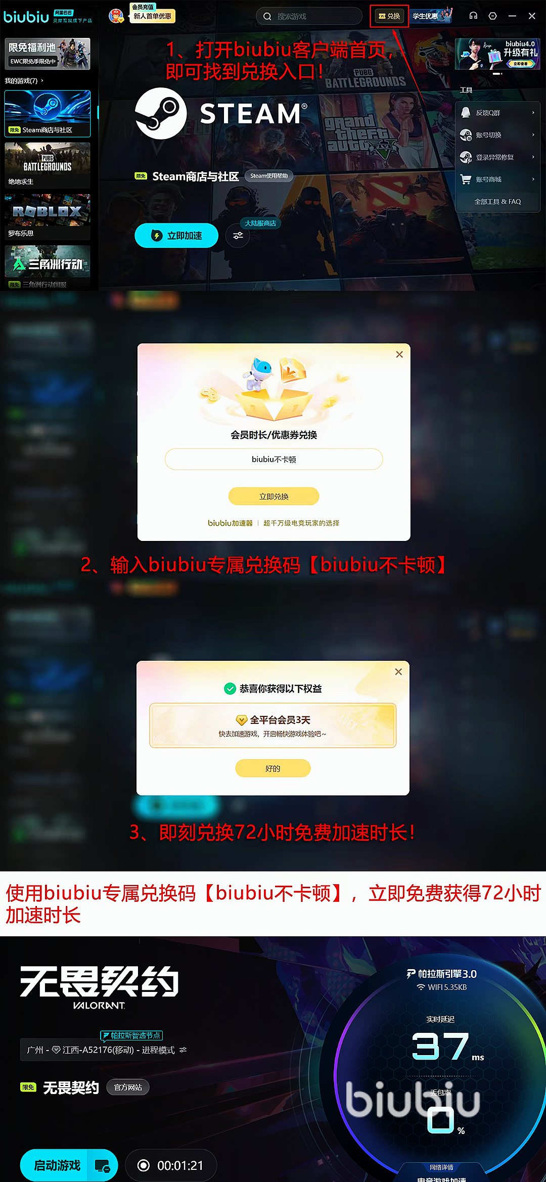 新用户完成注册即可获得24小时全游戏免费加速权益,有效缓解因网络抖动引发的延迟、掉线与闪退问题;同时开放口令兑换通道,所有用户进入兑换中心输入【biubiu不卡顿】,还可额外领取3天加速时长。