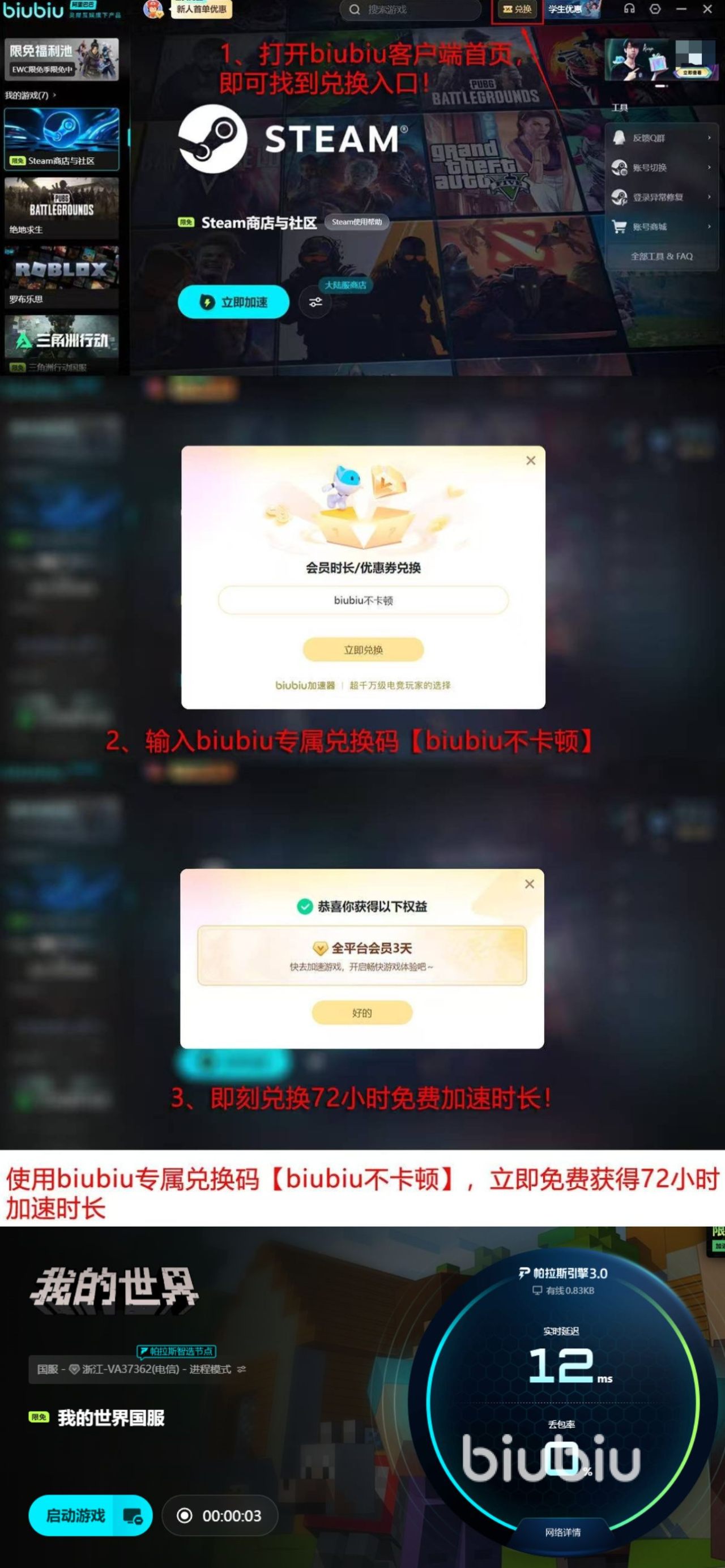 该工具由XDD小叮当担任品牌代言人,同时也是PUBG职业赛事冠军选手小叮当官方指定使用的加速软件。其核心技术为自主研发的帕拉斯3.0引擎,支持动态带宽分配与连接状态实时自愈,从底层通信机制上压缩闪退发生窗口。新用户完成首次注册后,系统自动发放24小时免费加速时长;输入专属兑换码【biubiu不卡顿】,还可额外获得72小时使用权,累计达96小时,全程无需付费,充分验证实际效果后再决定是否续订。