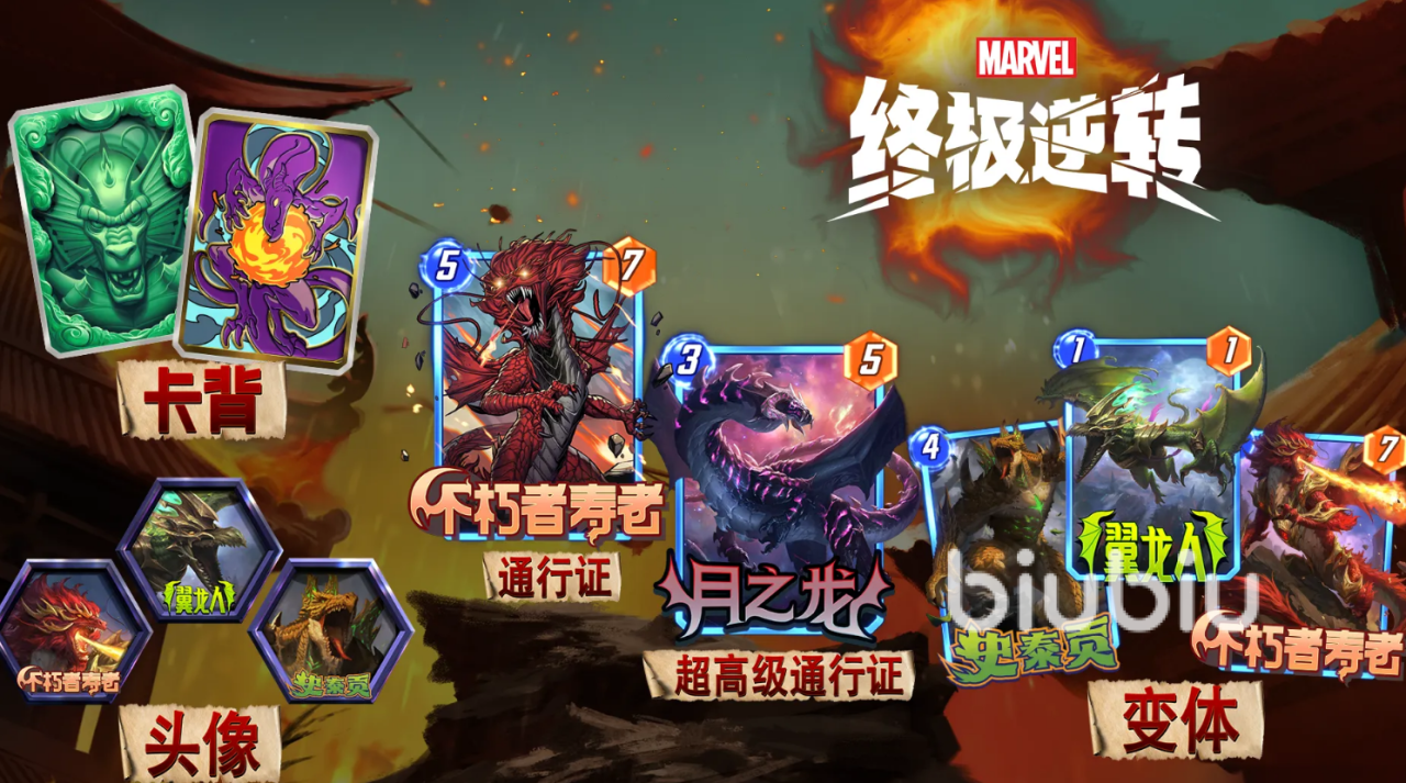 本赛季推出双阶通行证机制:基础赛季通行证售价为常规档位,购买后即可立即获得限定角色“不朽者寿老”,并随等级提升逐步解锁专属变体卡、头像、边框等个性化资源;超高级通行证在基础权益之上额外提供“月之龙”变体卡,同时附赠该角色的基础卡。未购入超高级通行证的玩家,仍可通过合成系统或SNAPPACKS途径获取“月之龙”基础卡,保障角色收集的可达成性。