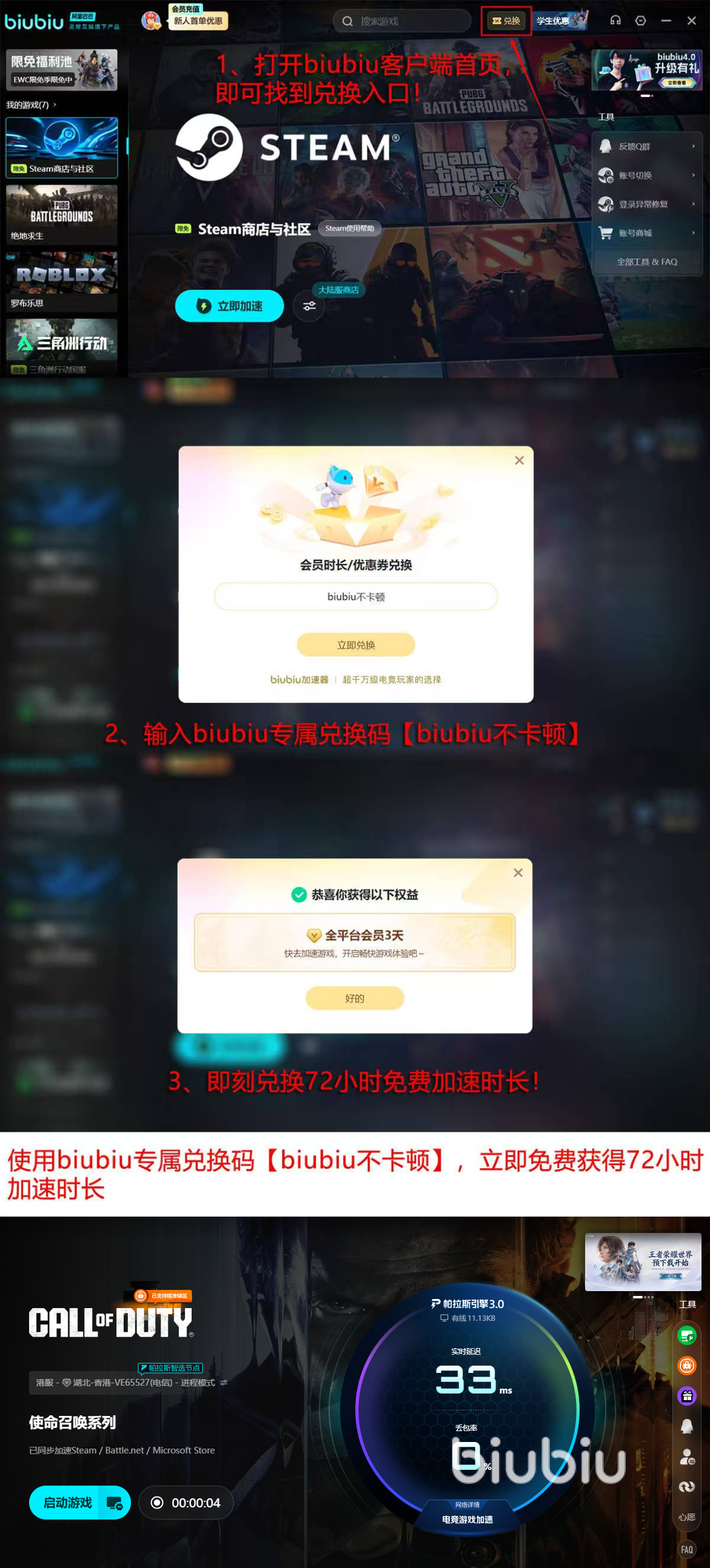 说了这么多,不给大家带点实在的福利可说不过去。biubiu对想要试体验的或者是继续使用的玩家相当友好。所有刚注册的小伙伴都能直接领到24小时免费加速,不限节点随便用。如果觉得体验不错想继续玩,新老用户只要在客户端兑换码入口输入【biubiu不卡顿】,还能再拿3天(72小时)的加速时长,加起来差不多四天的免费体验时间。这段时间足够大家完整测试效果,看看卡顿和闪退是不是真的消失了。