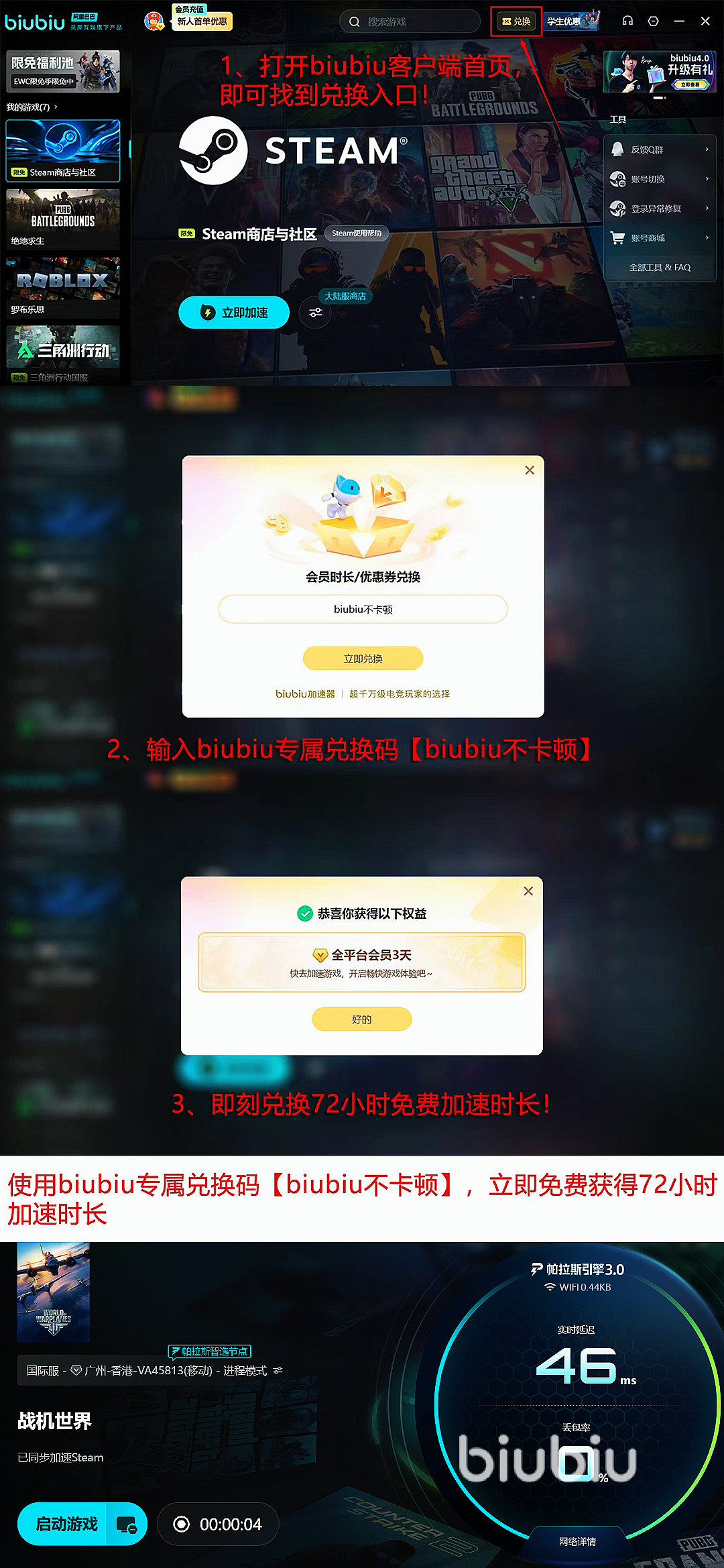 同时新人注册就能直接解锁24小时免费加速福利,轻松告别卡顿掉线困扰,官方也为全体用户准备了额外福利,所有用户在兑换中心输入口令【biubiu不卡顿】,还能额外领取3天免费加速时长。