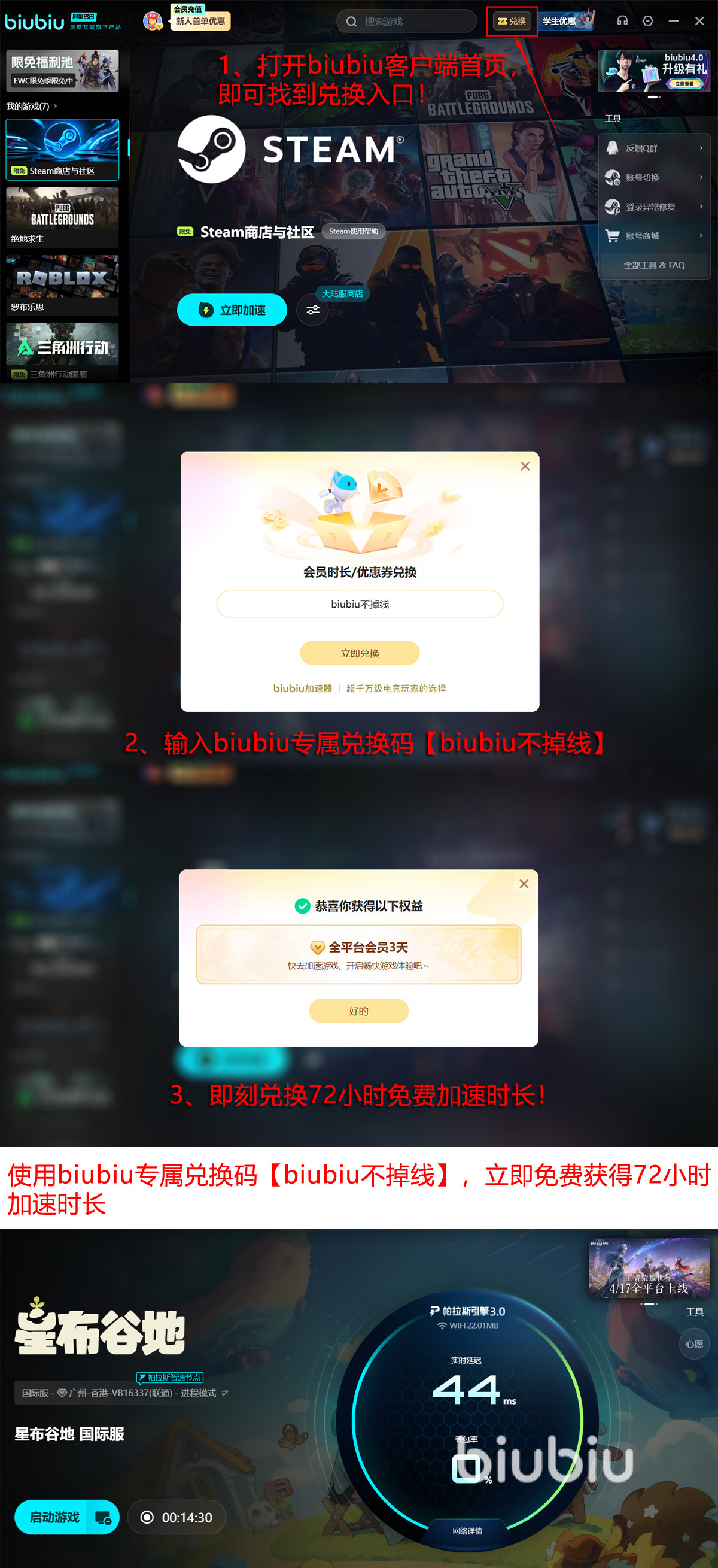 现在第一次注册账号系统直接送你24小时提速,然后你在软件里用【biubiu不掉线】又能额外领到72小时,这俩加起来整整96个小时的服务。