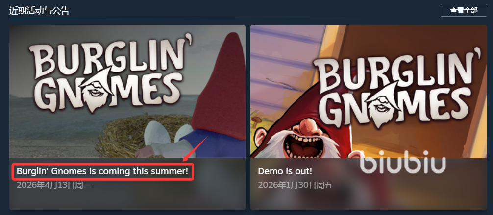 根据官方最新公告显示BurglinGnomes将于2026年夏季到来,也就是6-8月之间。虽然尚未公布确切的日期,但如果已经迫不及待想加入这场地精狂欢的话,最好的方式就是立即访问steam商店页面,点击添加至您的愿望单。
