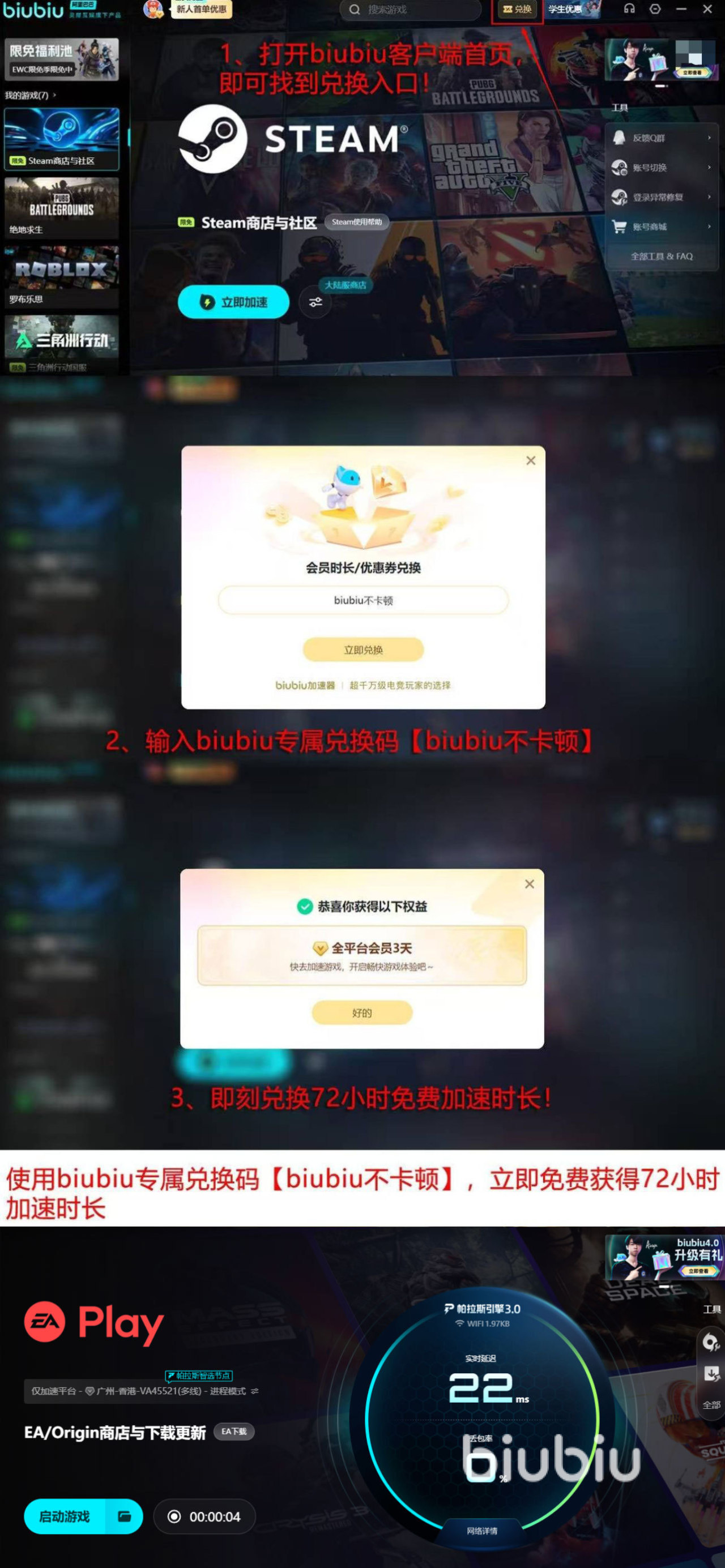 除了强大的技术支撑,biubiu加速器还和知名电竞选手小叮当达成了合作,凭借出色的性能获得了不少玩家的认可,成为很多玩家玩EA游戏时的首选加速器。同时,biubiu加速器也为新人准备了丰厚的专属福利,新人首次注册就能直接领取24小时免费加速时长,输入兑换码【biubiu不卡顿】,还能额外获得72小时免费加速,两者合计96小时,足够新玩家充分体验流畅的游戏网络。