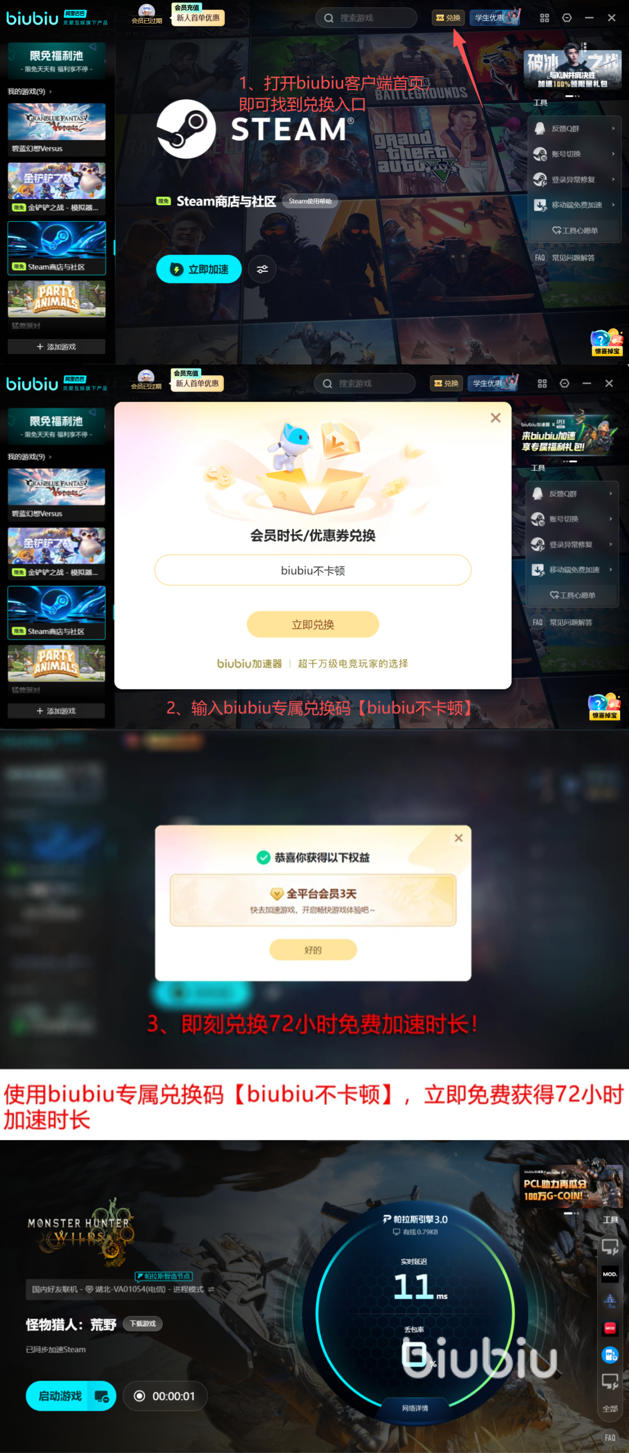 现在行动,立享biubiu加速器新人专属豪礼。新用户注册即赠24小时全平台高品质无门槛加速权限!输入专属口令【biubiu不卡顿】,立即额外加赠72小时免费加速时长!总计畅享96小时,也就是整整4天免费优质加速,让大家能无阻探索怪物猎人荒野的壮丽世界!