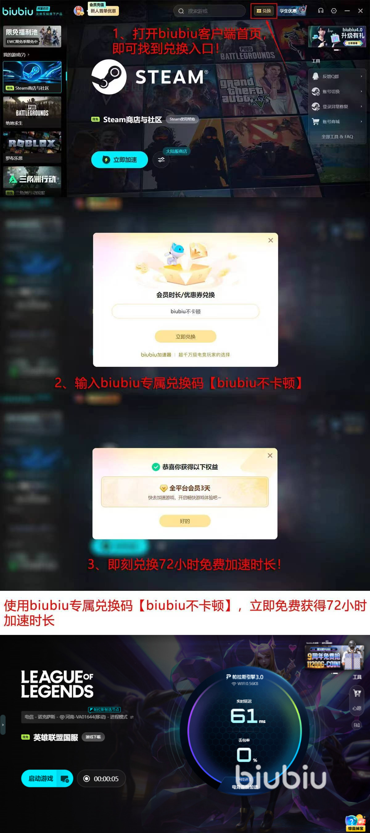 新用户在完成注册激活之后就可以享受首日24小时之内所有的功能使用权限。输入【biubiu不卡顿】,可以得到另外72小时的试用时间,总共有96个小时可以免费使用。该机制目的就是让玩家可以充分去感受平台出色的加速服务。