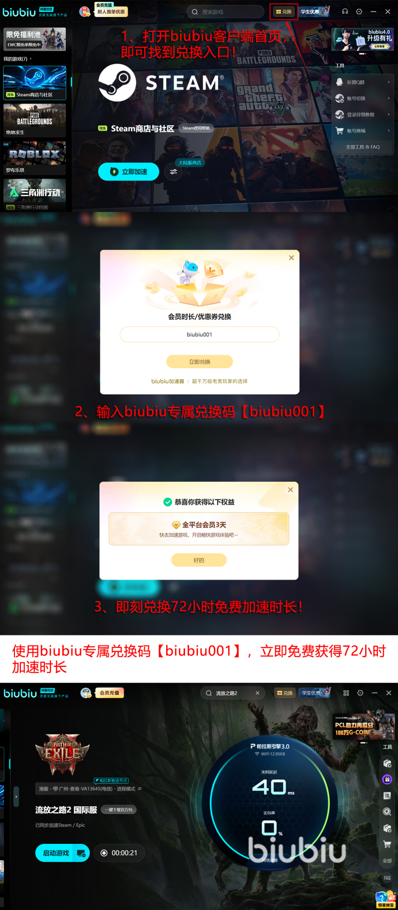 在福利方面确实还是很有诚意的,所有人都可以免费获取加速时长。新用户如果是第一次注册,那就可以得到一个新手礼包,时间是24小时。还有一个通用兑换码,玩家只要在加速器的页面复制口令【biubiu001】,新老用户均可领取3天免费加速时长,不会要求大家强制性的完成任务或者是观看广告,在叠加之后就能免费长达96小时。