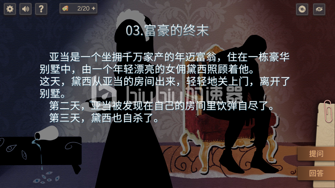 剧情设置上没有太过于黑暗的地方,都是很纯粹的悬疑推理,其他基本都是海龟汤的一贯套路。在提问时还有一个彩蛋,在提出的问题中有关键性线索的问题时,会触发“精彩提问”的判定,十分有成就感。