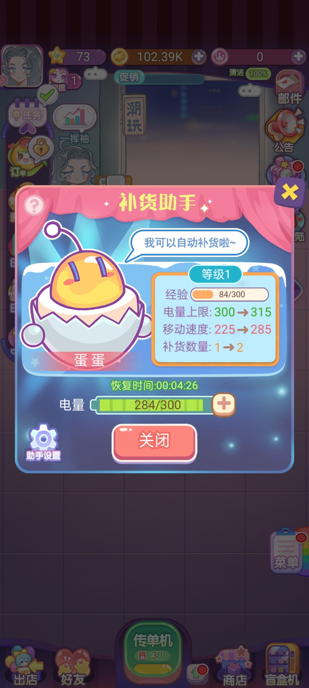 游戏主页默认的商店页面能看到在右边有个十分可爱的机器人在待机中,这个机器人就是游戏里的补货机器人,可以通过设置这个机器人让它来进行自动补货。点击机器人会跳转出机器人的页面,会显示补货机器人的等级,经验,开启,关闭按钮,剩余的电量,每次补货的数量,机器人的移动这些信息。