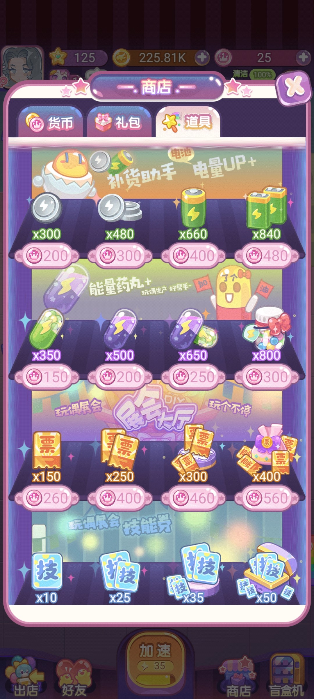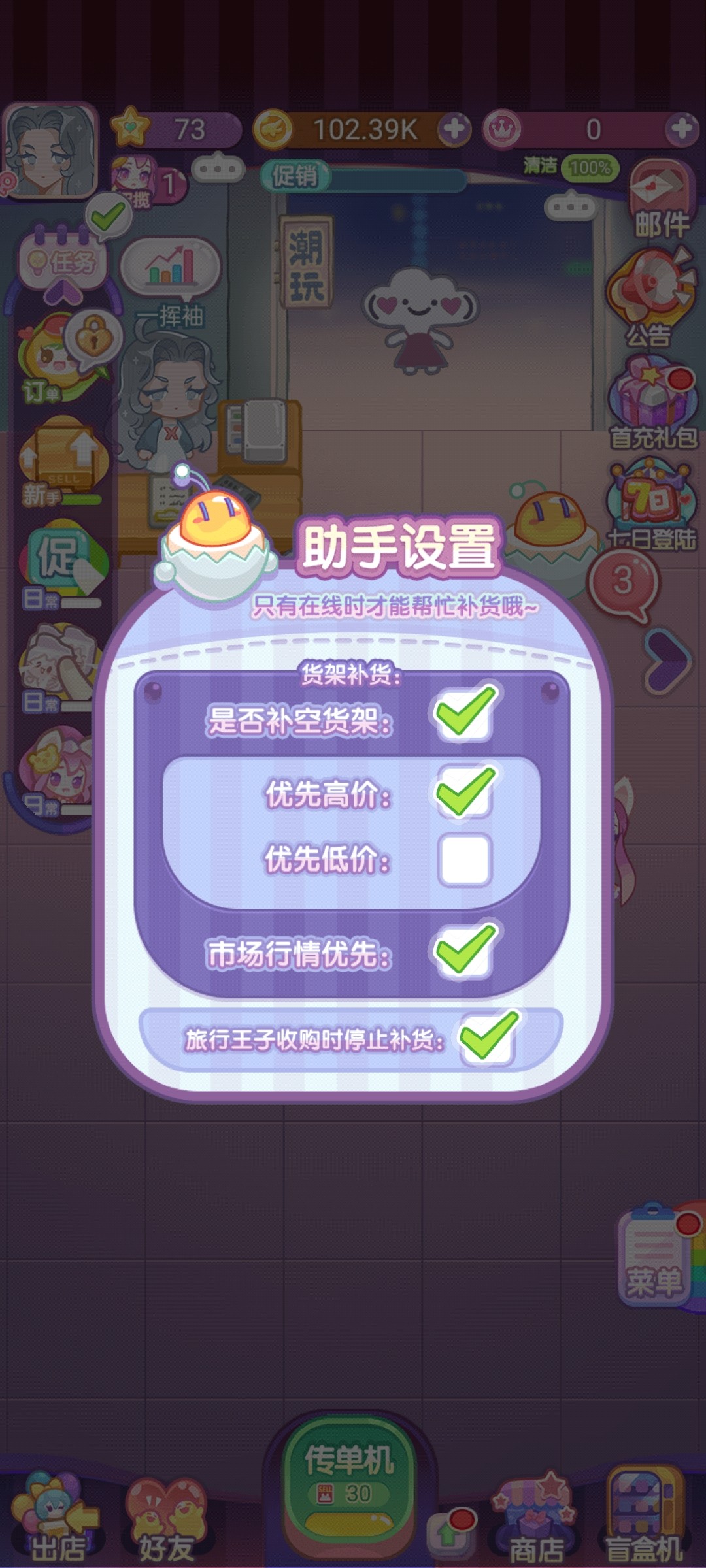 造物梦工厂中的货架有限,升级所需要的金币也比较多,一次能上架的玩偶数量有限,要每次靠人在线守着上架就太麻烦了,所以游戏中开放了自动补货的功能。