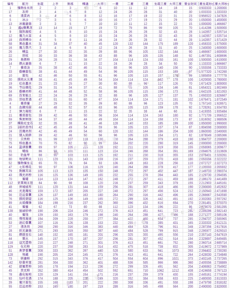 可以出售的炼金物品有150种研制产物和40种秘方产物。要筛选出高秒金的物品还是需要花费一定的功夫进行对比。同时炼金产物也是有门槛的,需要循序渐进慢慢解锁。所以可以在游戏前期先把有限的产物进行对比选择性价比高的进行炼金出售。可以把单个产物的熟练度练上去,能明显提高性价比。以下是秒金排行表。