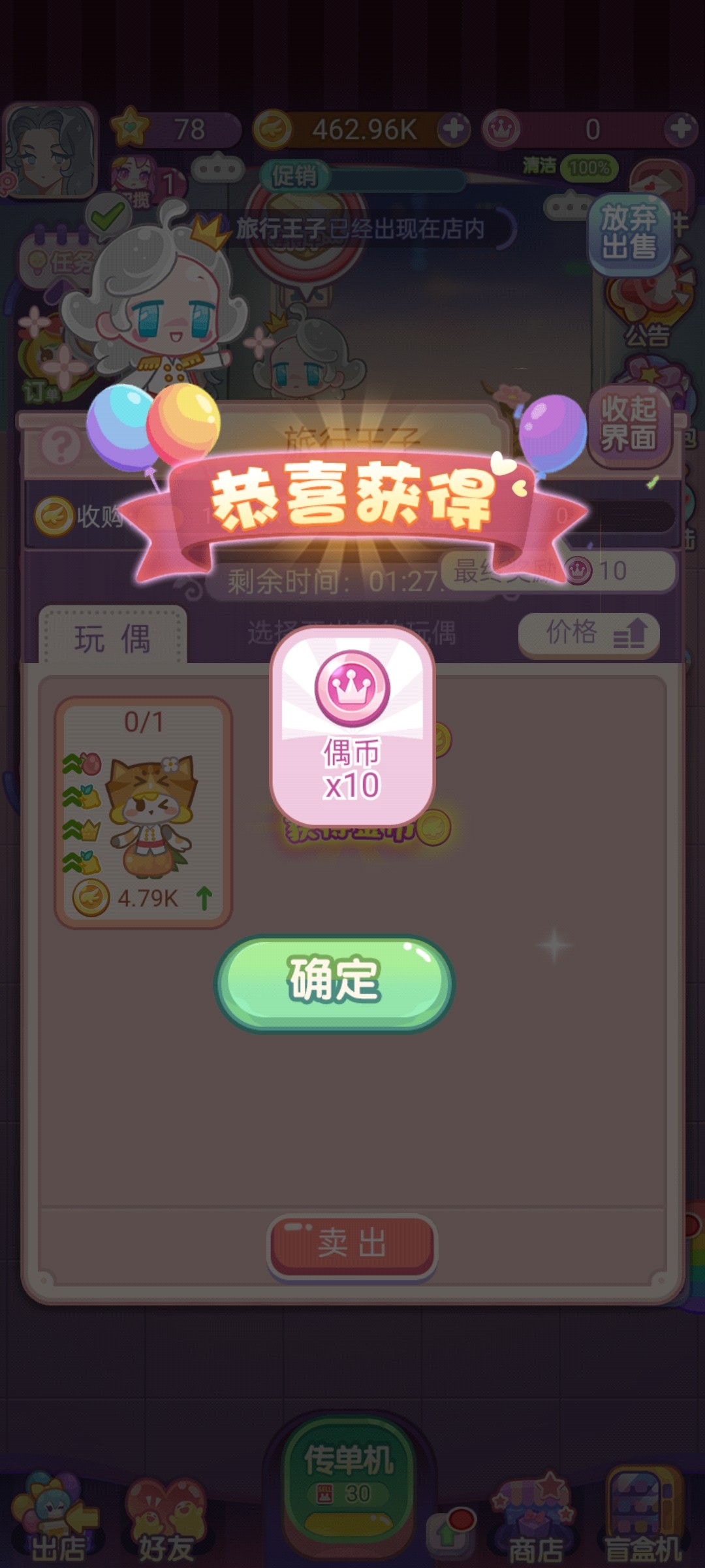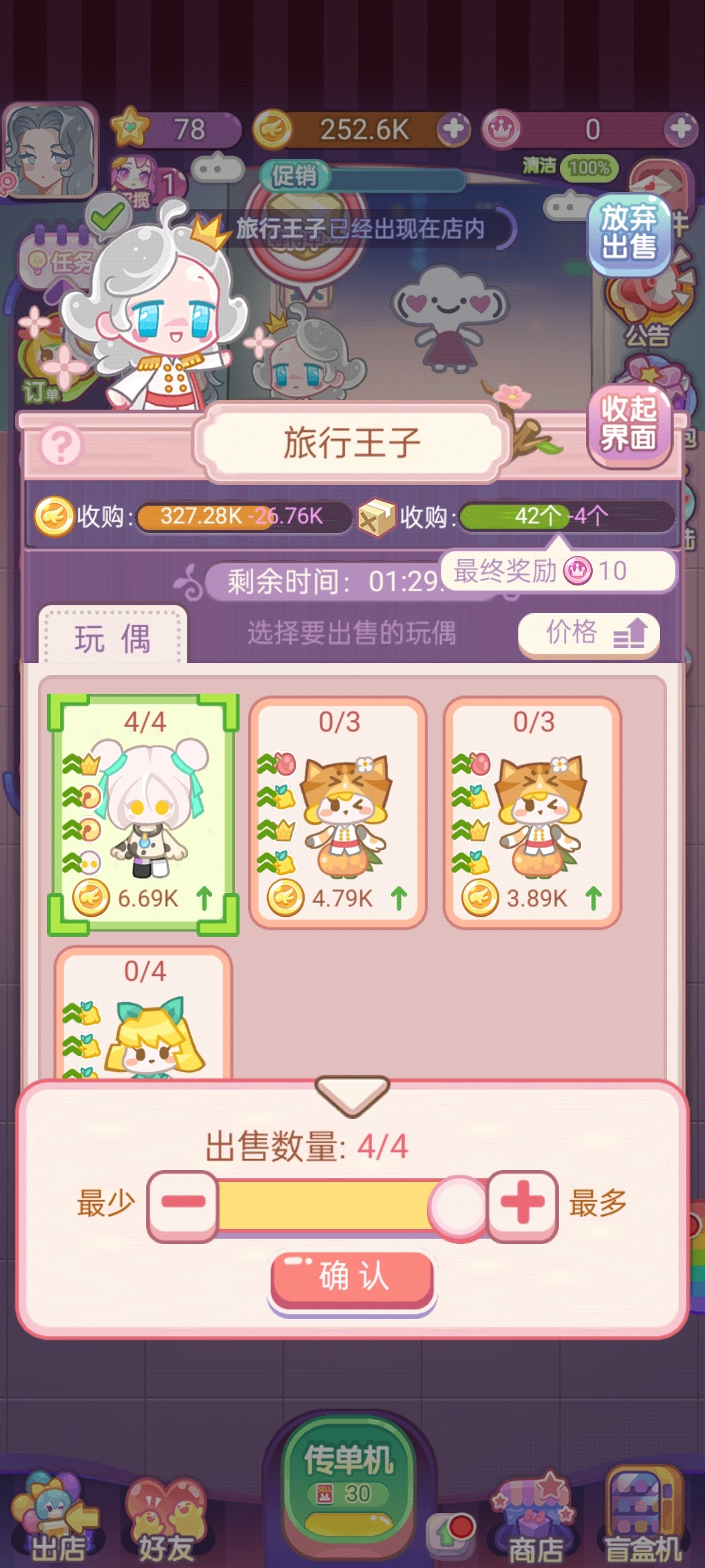 当看到系统提示旅行王子已经出现在店内时,记得切回到商店页面,这时旅行王子会出现在角色的身边,站在店门口,点击旅行王子头上的货物图标可以打开页面,选择自己制作的玩偶出售给旅行王子。