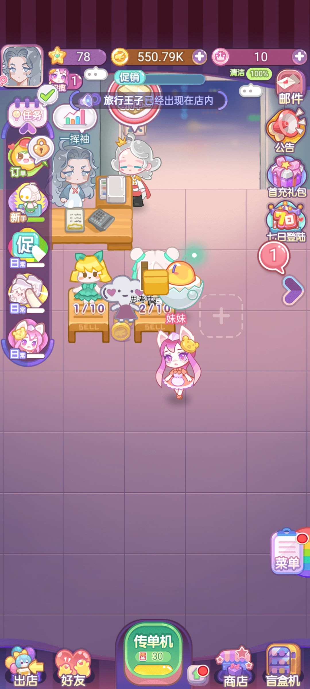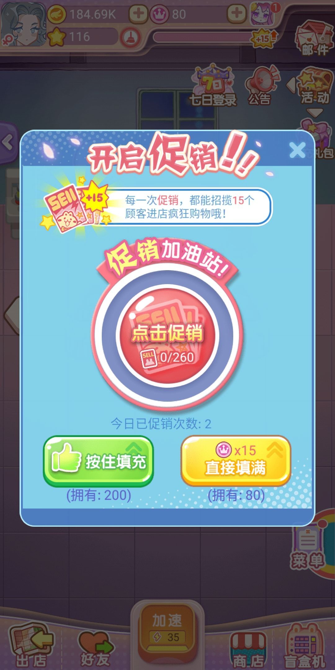 发动促销后,就会发现店内客流量激增,玩偶以极快的速度出售掉,可以在促销阶段守着手动补充货物。