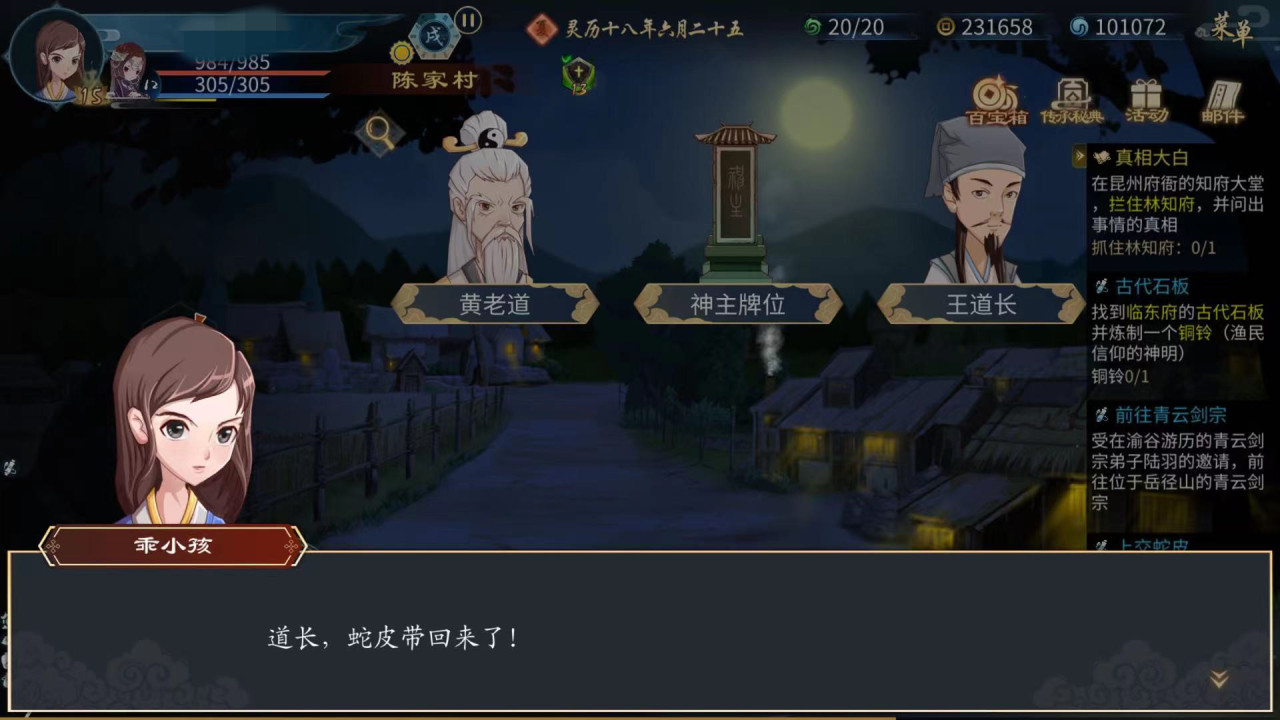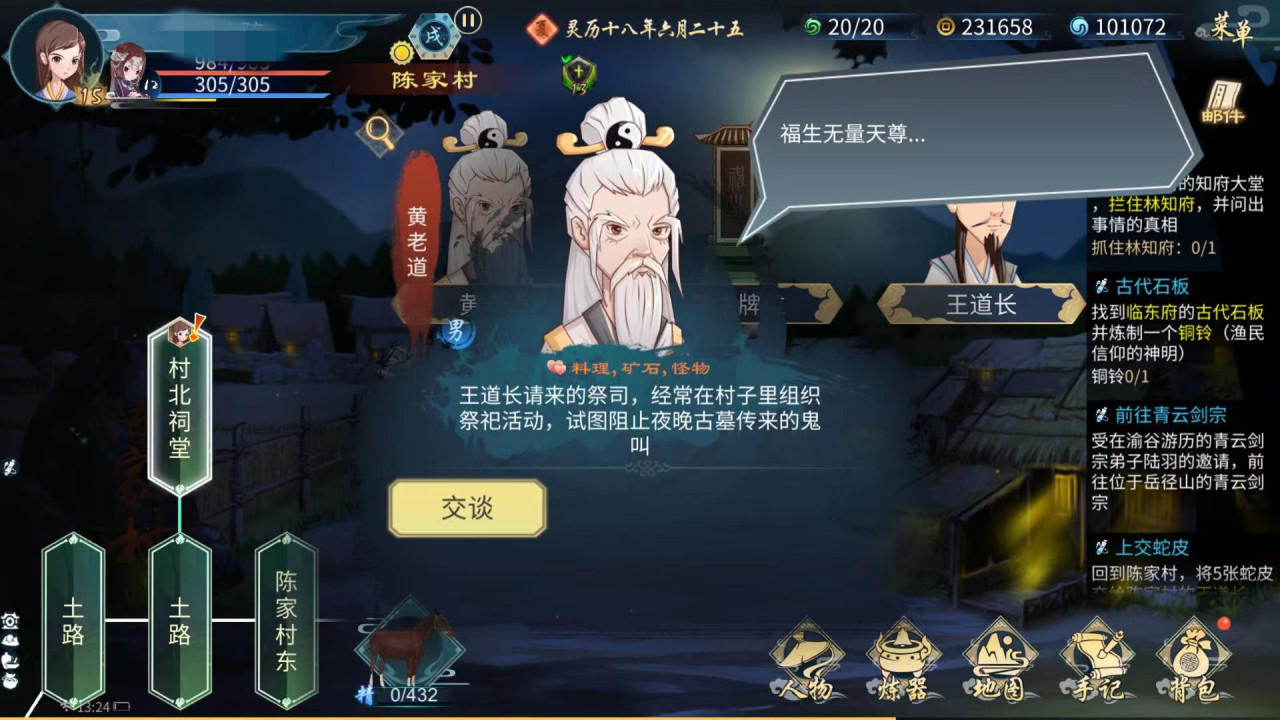 在此地点还包括王道长,他是陈家村祠堂的道士,早年间入赘陈家村,现在负责村中的祭祀活动,通过修葺祖坟,制作法器最好的材料就是蛇皮,需要女侠在后山小路中打些蛇皮供制作法器使用。