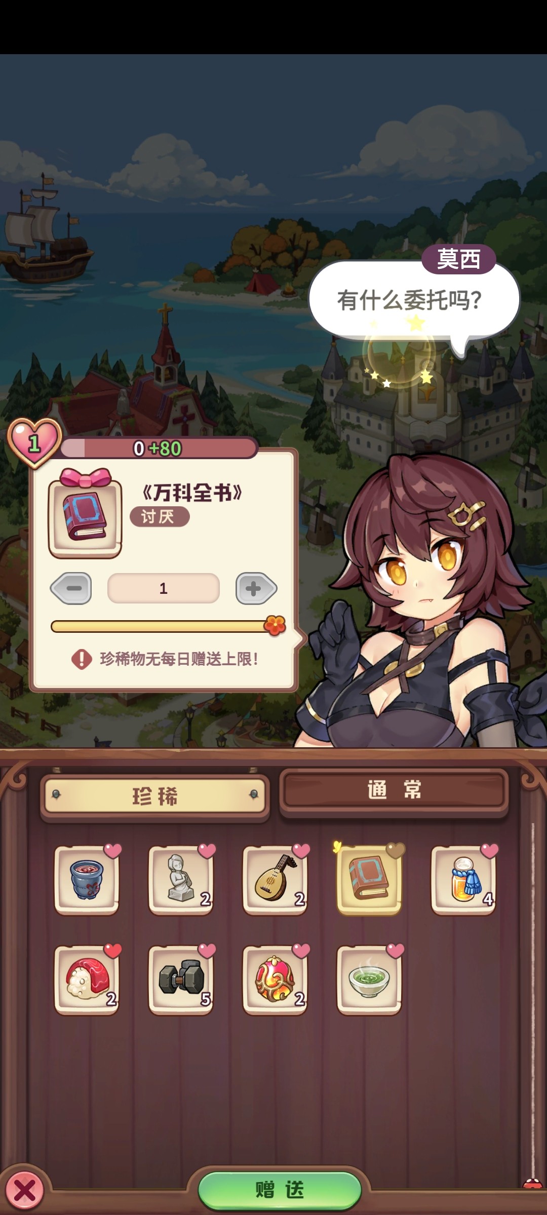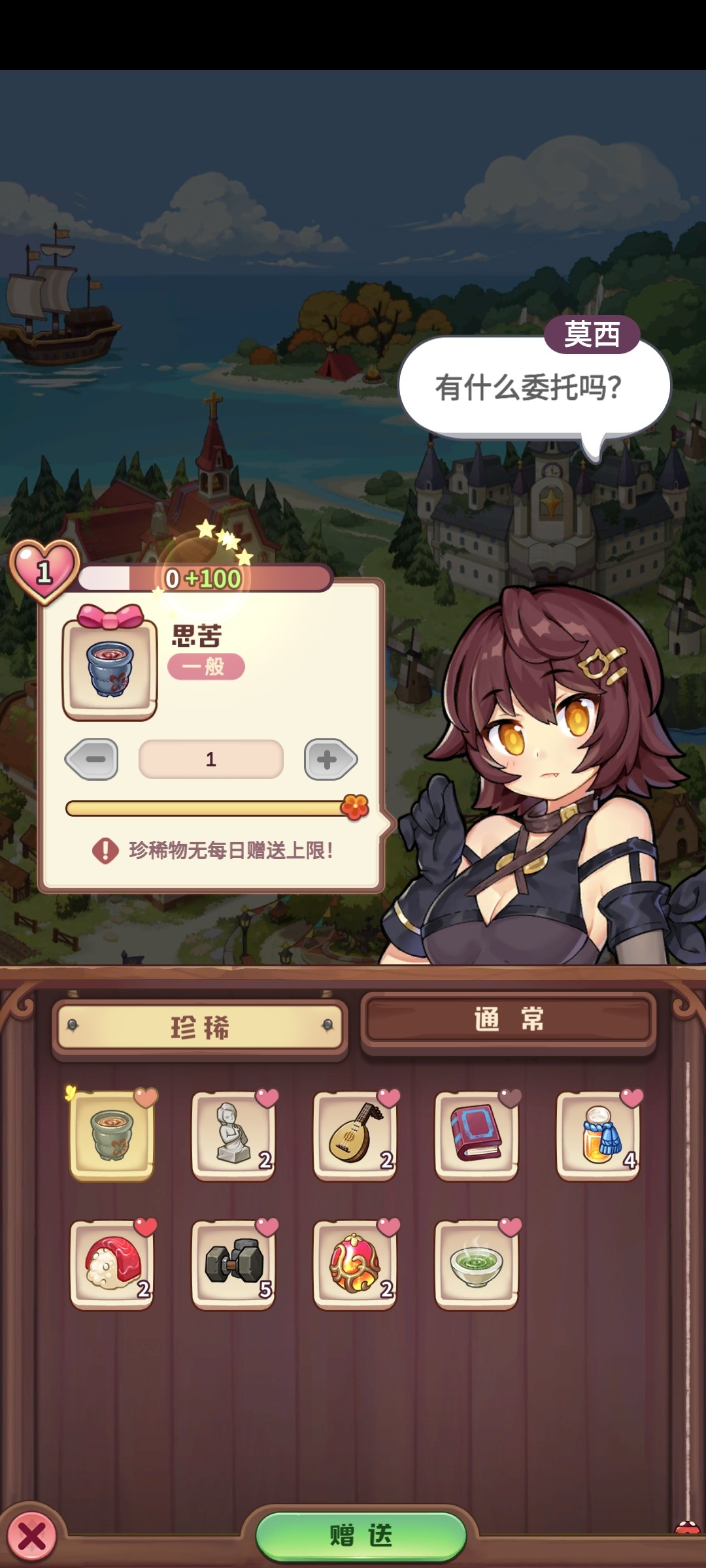 能给NPC增加好感动的道具很多,要从其中挑选出适合的礼物。在莫西的送礼页面可以看到所拥有的道具,分为了珍稀道具和通常道具。通常道具可以是自己制作出来的炼金产品,珍稀道具通过游戏活动,任务等途径获得。
