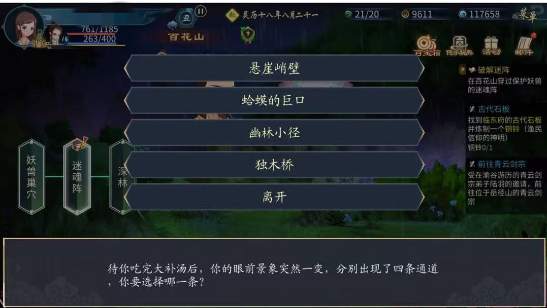 首先出现的问题是一道鬼瘴拦住了你,此时你应该如何?此处需要选择向后走,已退为进,反其道而行之,才是正确的道路,当闯过第一道鬼瘴后,此时摆在你面前的是一桌子食物,不选择不能继续前行,那么你会选择?此处应该选择大补汤,大补汤十分滋补,喝光后感觉浑身充满力量。当喝完后,以前景象突然改变,分别出现了四条通道,此处应该选择?