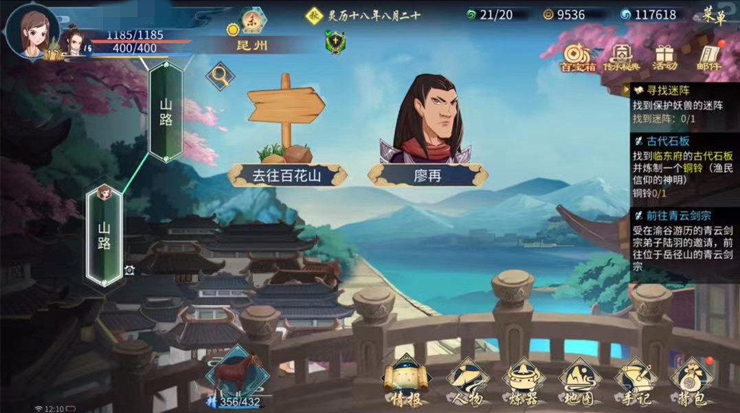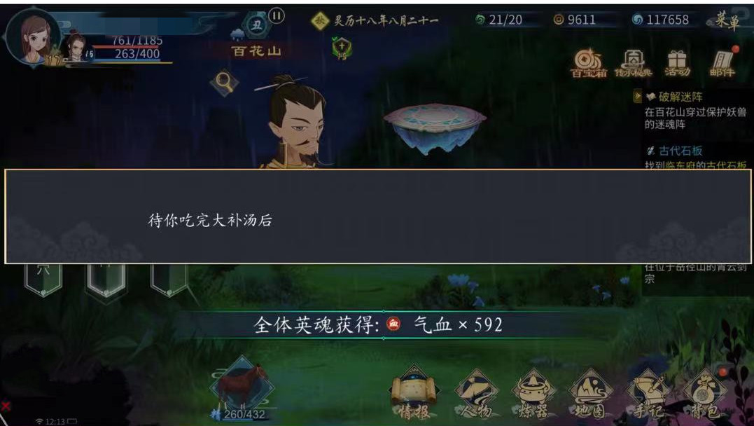 玩家进入游戏后,可以在主页面中看到多种不同的活动,在主线活动中随着不断的查找碎布的线索后,找到历矶风,继续寻找保护妖兽的迷阵。从昆州南部前往百花山。从烟雨楼出发向南走找到山路,即可通过山路进入到百花山,从百花山山脚继续向南行走,从林中空地下穿过三个深山,继续沿着路线向北走。会出现迷魂阵地点,在此地点中,需要破解法阵。