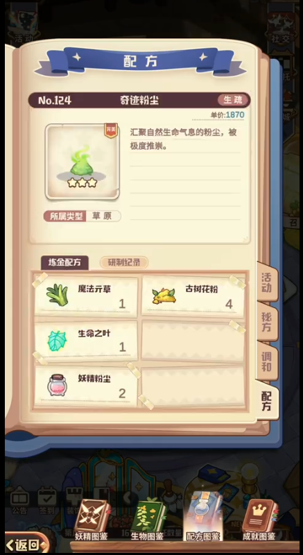 炼金中有分为调合、研制、秘方、活动这四种。调合和研制都是获取到材料以后可以自己在研制中进行尝试来直接研发出炼金产物,来解锁配方。但是秘方是需要获取到秘方道具以后先解锁了秘方配方,才能进行炼金制作。所以秘方是隐藏型的配方,研制是开放型的。
