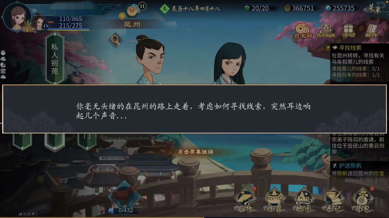 随着玩家不断挑战会出现任务-线索任务,在昆州转转,寻找马车和翠儿的线索。随着路线走即可找到马车地点,到达东长街后沿着路线走,当玩家到达昆州后,随着路线指引毫无头绪时耳边传来声音,原来此处就是翠儿的住址,听到几个长舌妇的议论,原来这就是翠儿的赎身之地,然后进入计划实施阶段。