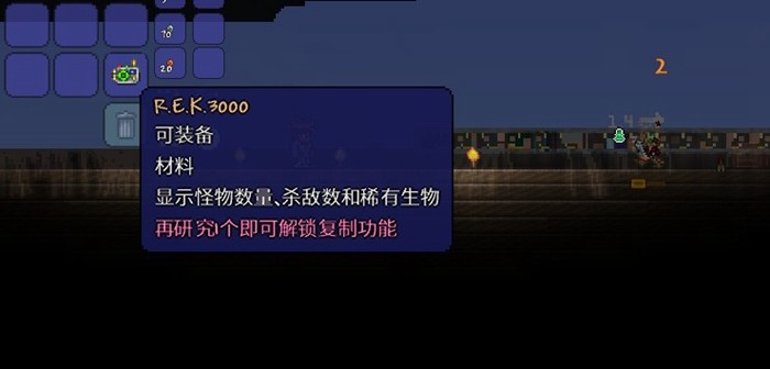 而在泰拉瑞亚游戏中记录刷怪数据大部分的用途就是我们在刷敌怪旗的时候,获取敌怪旗并且将其插在地上时可以让范围内的玩家受到一些增益效果。而敌怪旗的掉落就是跟我们的杀怪数量是有关的。另外,我们可以使用生命体分析机、雷达以及杀怪计数器这三种信息显示类的配饰合成REK3000,REK3000同样也是信息类的配饰,但是拥有上述三个配饰所有的功能,节省了配饰栏。