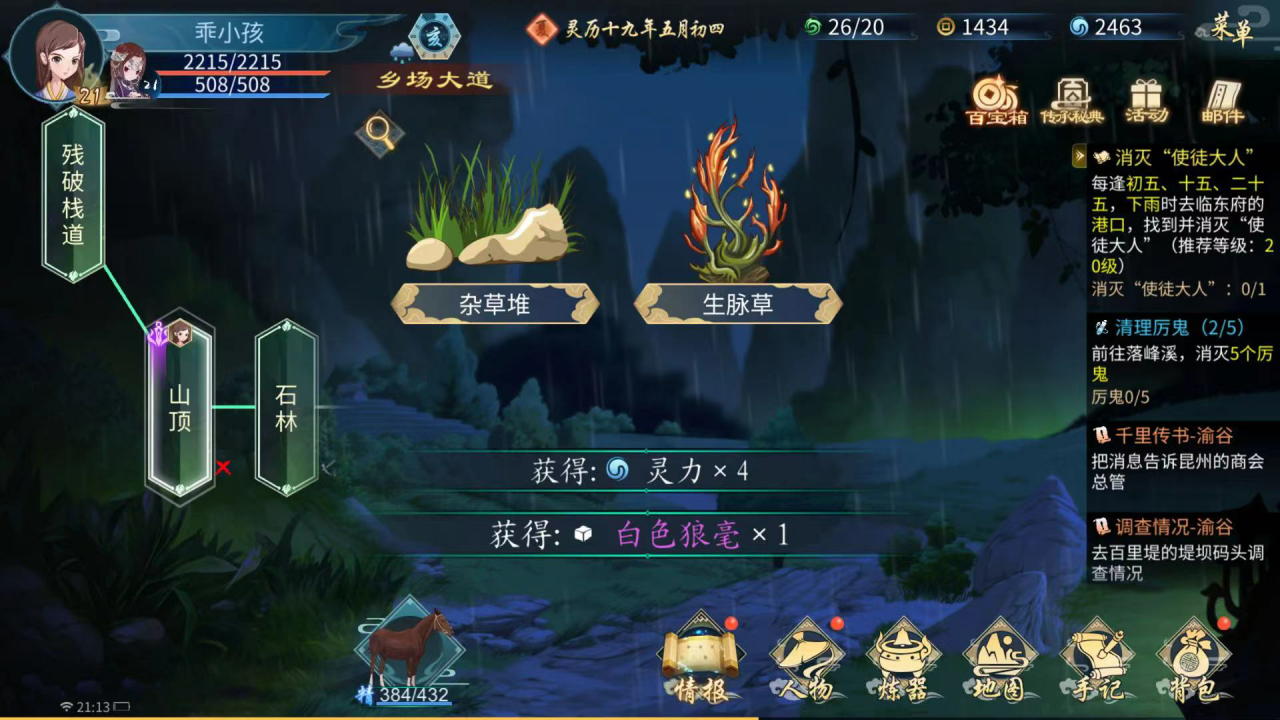 可以通过翻找杂草堆,查看杂草堆是否有其他物品隐藏,在生脉草中可以通过消耗精力进行采集,当采集成功后可以在背包中查询到,用于后续各项任务或炼制丹药使用。