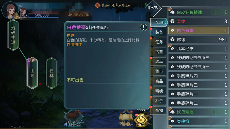 2021年10月01日 14:06 来源:乖小孩灵历十八年游戏中包括多种不同的道具,白狼毫,河神雕像等,玩家在不同的地点即可获得相应的道具,今天小编带大家了解一下灵历十八年白狼毫怎么获得。