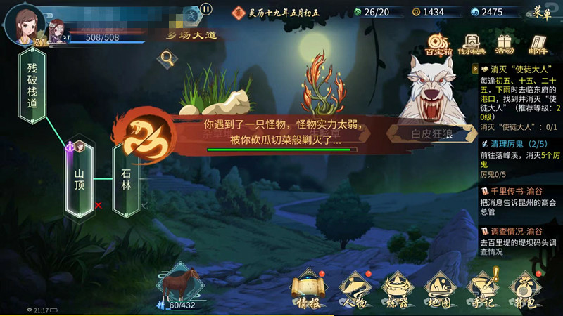 玩家可以在陈家村中看到包括各种不同的地点,根据此地点一直向东走,走到村东大路后去往乡场大道,进入乡场大道后找到山顶地点,在野猴山入口中有山顶位置和野猴窝位置,选择山顶位置进行前行,会看到在山顶中包括杂草堆和生脉草,偶尔会出现白皮狂狼怪物,通过选择人物进行挑战怪物,当挑战成功后可以获得不同道具,其中包括白狼毫,灵纹,白皮狂狼精魄等道具。白狼嚎道具可以在村中的诸葛毛笔屋制作成毛笔使用。