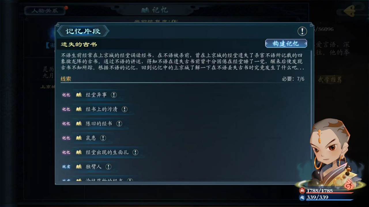 记忆点2,在书库中找到春芽与他沟通,获得经书上的污渍记忆点,记忆点3,在上京城的藏书阁中查看经书,发现陈旧的经书记忆点,记忆点4,在民居找找到老鼠和破纸屑,调查老鼠,获得鼠患记忆点,记忆点5,在千福酒家与葛全沟通,完成经堂出现的生面孔,回到现实中,与经堂内的鲁迅沟通独臂人,获得独臂人记忆点6线索。