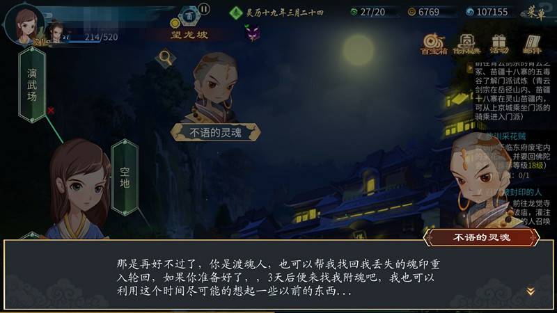 玩家进入游戏后,可以在主页面中看到人物列表,在人物中包括不语,在进入望龙破后在破庙中找到不语附魂,等待三日即可获得不语的附魂,不语是归一老祖领养的孤儿,天性淳朴,不爱言语,是唯一得到归一老祖真传的武僧。将1000灵力灌注给不语,完成对不语的附魂。