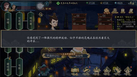 即可开启寻找不语记忆任务,前往上京城地点,在此地点进行闲逛,查找不语生前记忆,从破庙地点向下走到京道,即可进入上京城地点,在地图中找到经堂地点进入,感觉一阵强烈的精神波动,不语的灵魂经历着重大的冲击,出现了很多异常磁场,不语感觉到在这里遗失了记载四象擒龙阵的古书,即将开启第一次记忆。