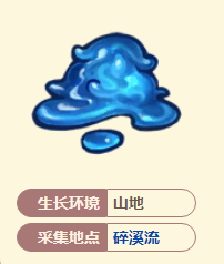 配方材料中的冰髓是千年冰山中的冰髓,散发着能够让任何物体上冻的温度。生长环境是山地,采集地点是碎溪流。