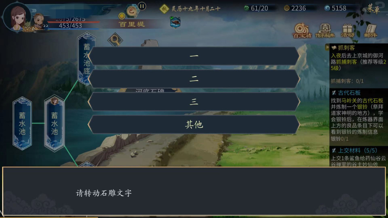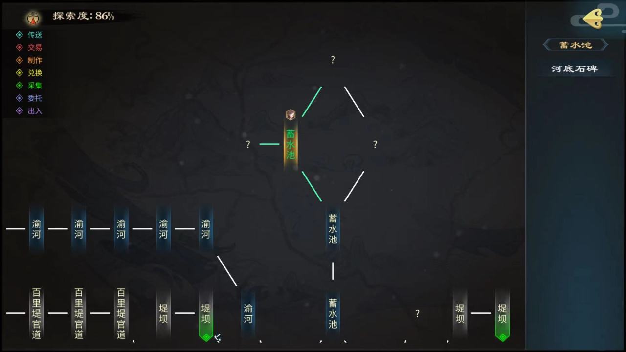 即可沿着渝谷的水路一直到百里堤行驶,当到达百里堤坝后,继续一路向东,走到渝河的分叉路口时,可以看到蓄水池地点,继续向上走,即可看到含有四个蓄水池地点,每一个蓄水池中都包含河堤石碑,通过转动河底石碑文字,填写符合条件的数字,即可成功开启河堤石碑,获得灵纹道具。