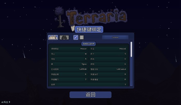 以我们初始的武器铜短剑为例,我们按下鼠标左键就是往前戳一下。如果想要触发第二次攻击的话,就必须要手动再点击一次鼠标左键,这显然不是自动挥舞了。我们按下ESC然后打开游戏的设置菜单,点击左侧的控件一栏,在这里可以看到很多关于游戏中按键操作的设置,可以对一些键位进行绑定,但是却没有自动挥舞的设置。